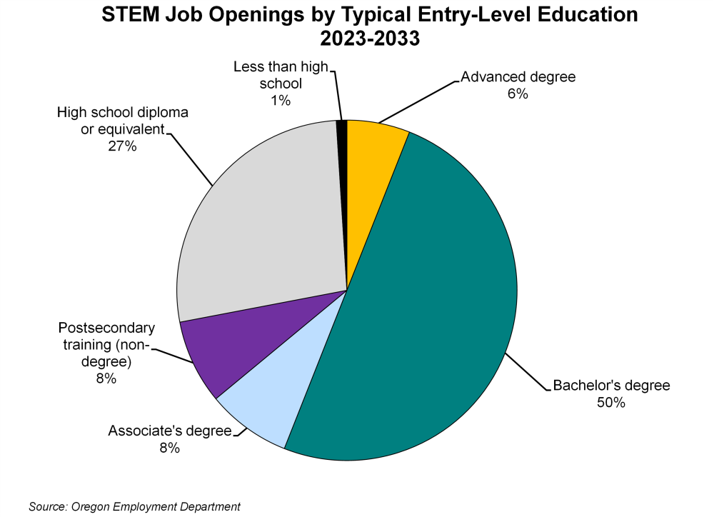 Looking at all projected job openings in Oregon, 76% of openings that require a doctoral or professional degree are STEM jobs. Forty-eight percent of openings that require a bachelor’s degree and 57% that require an associate’s degree are STEM jobs.