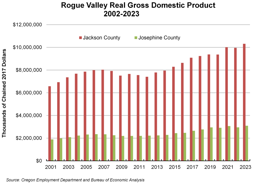 In 2023, Jackson County’s gross domestic product was $ 12.9 billion, which was an increase of 3.6% from 2022 and was the 345th highest GDP among 3,114 U.S. counties. Josephine County’s GDP was $3.9 billion, up 4.9% over the year to rank 796th highest. The Rogue Valley’s GDP increase was stronger than Oregon statewide (2.3%) and the U.S. increase (2.9%).