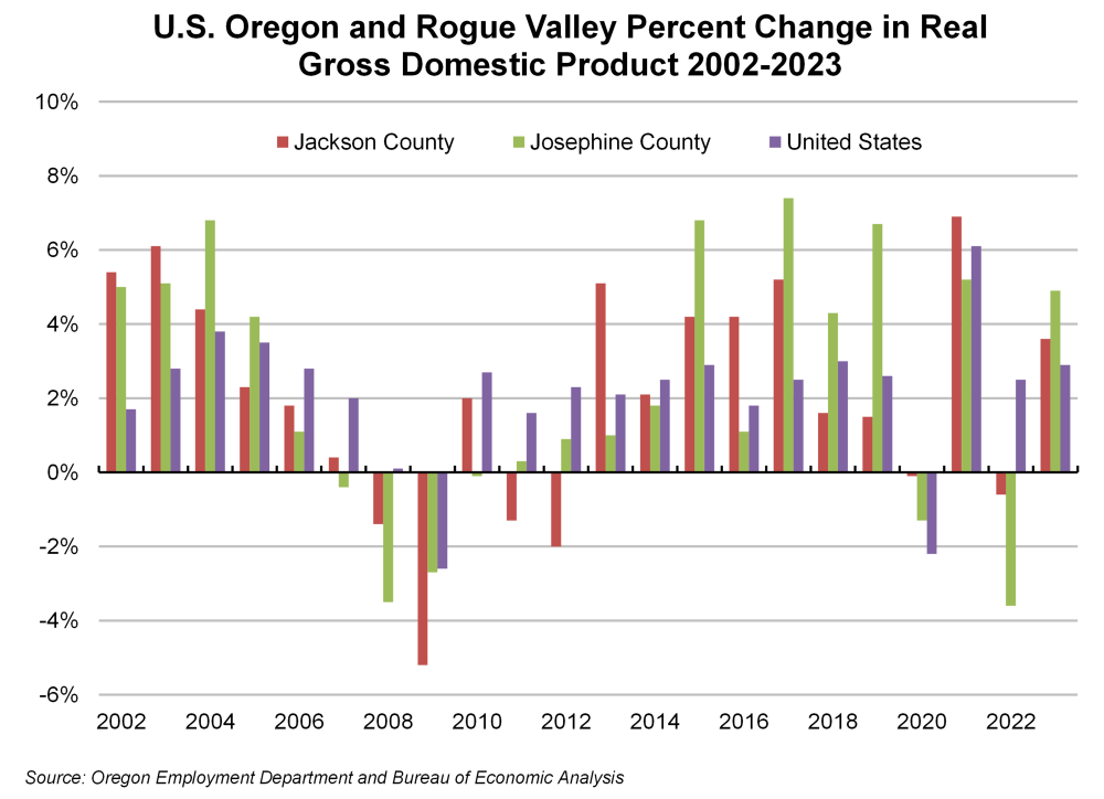 The Rogue Valley has roughly matched the state and national trend over time. Interestingly during the year of the COVID pandemic recession, the U.S. GDP fell by 2.2% whereas Josephine County GDP declined less, down by 1.3% and Jackson County’s barely budged, down by just 0.1%. The Rogue Valley did experience declines in 2022 of 0.6% in Jackson County and 3.6% in Josephine County while U.S. GDP rose by 2.5%.