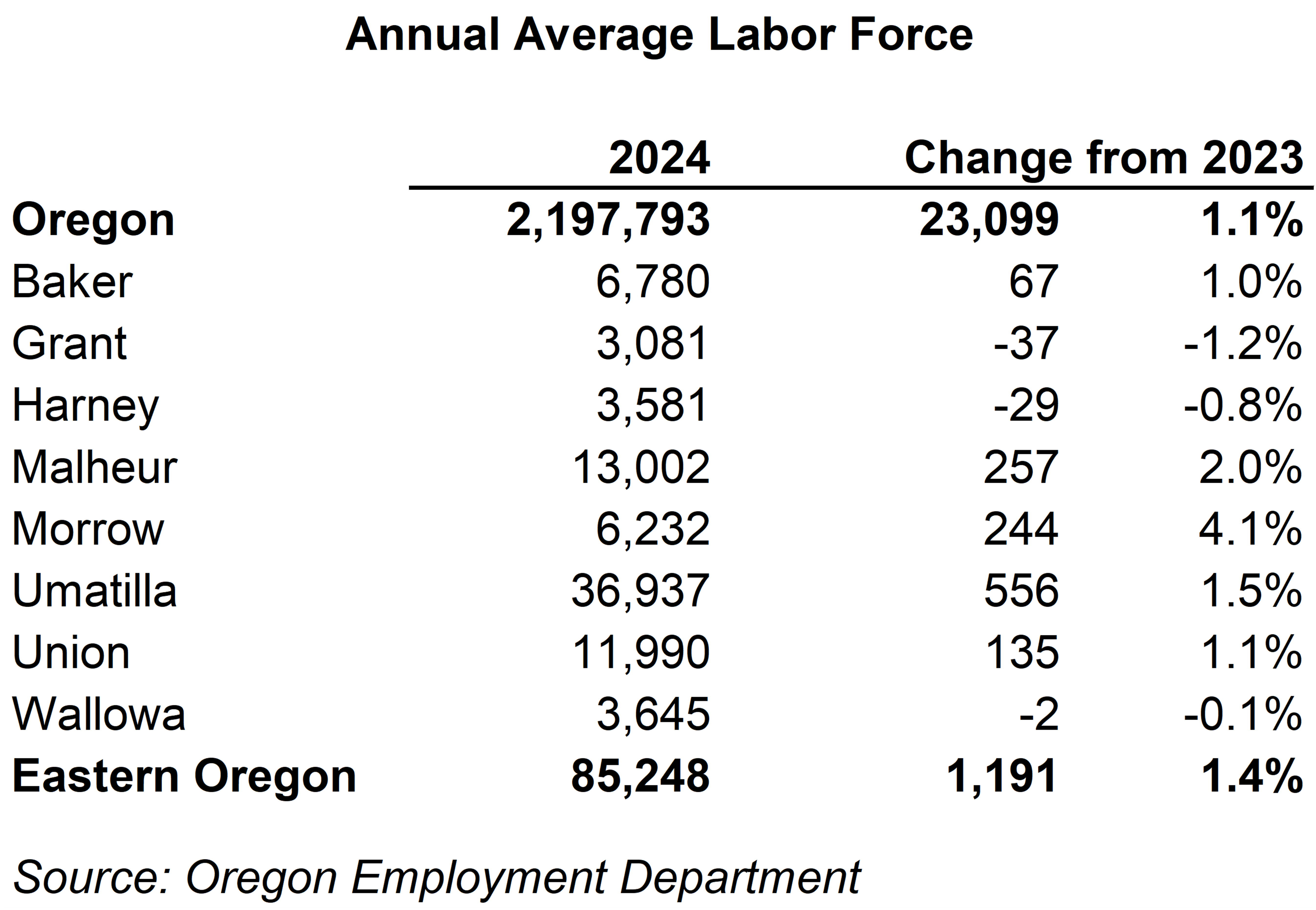 Eastern Oregon’s total labor force rose in 2024. The annual average labor force added 1,191 people for a gain of 1.4%, surpassing the gain of 0.9% seen in 2023. Despite the overall gain in Eastern Oregon, there were three counties that did see a decrease. Grant County took the largest loss at 37 people (-1.2%). Harney County’s loss was a little lighter, down 29 people (-0.8%), and Wallowa County was essentially unchanged by a decrease of 2 people (-0.1%). The largest gain came as Umatilla County added 556 people (+1.5%). Malheur and Morrow counties saw the second and third largest gains with the addition of 257 people (+2.0%) and 244 people (+4.1%), respectively.