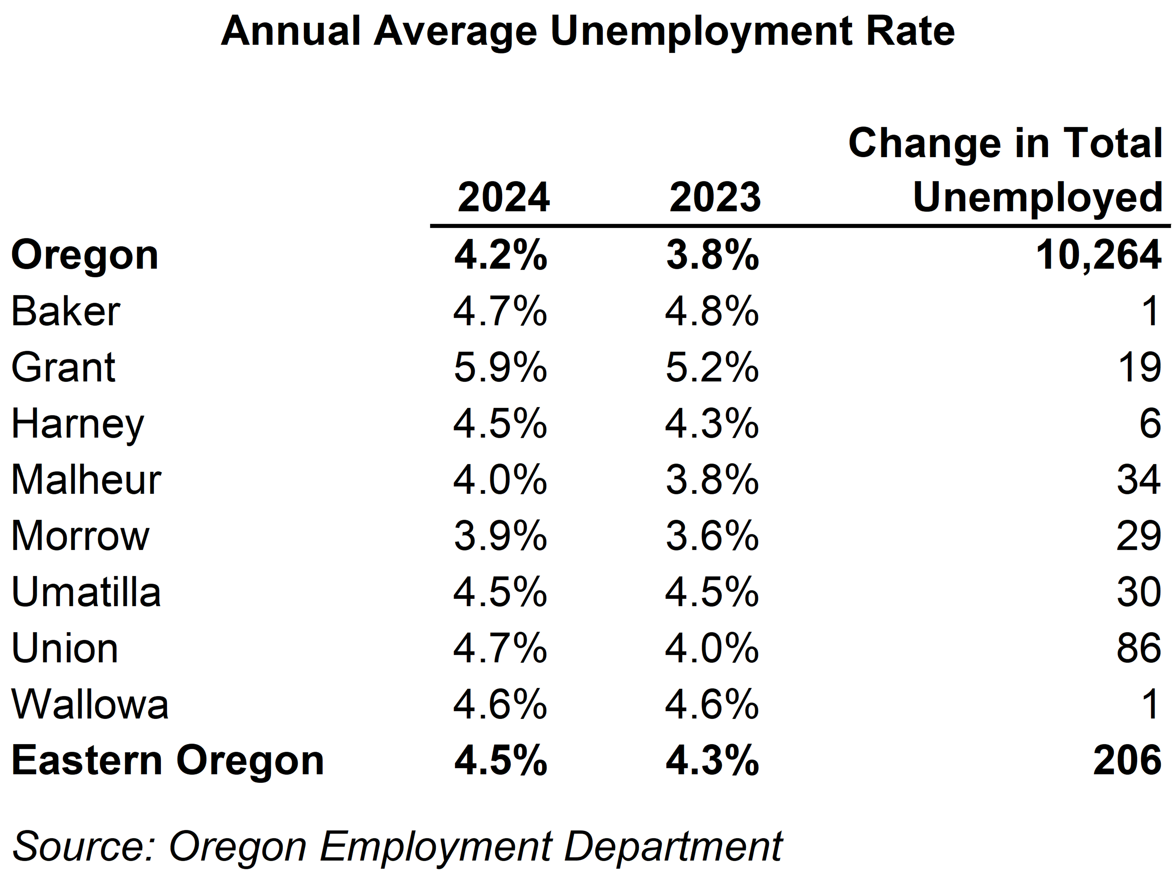 The annual average number of unemployed increased by 206 people. This raised the average unemployment rate for Eastern Oregon to 4.5% in 2024 from 4.3% in 2023. The total number of unemployed increased in each county for the year with six counties seeing higher unemployment rates while Umatilla and Wallowa counties’ rates held steady. Union County averaged 86 more unemployed throughout the year, the largest increase. Union’s unemployment rate rose from 4.0% in 2023 to 4.7% in 2024. Morrow and Malheur counties had the lowest unemployment rates for the region at 3.9% and 4.0%, respectively, up from 3.6% and 3.8% the previous year.