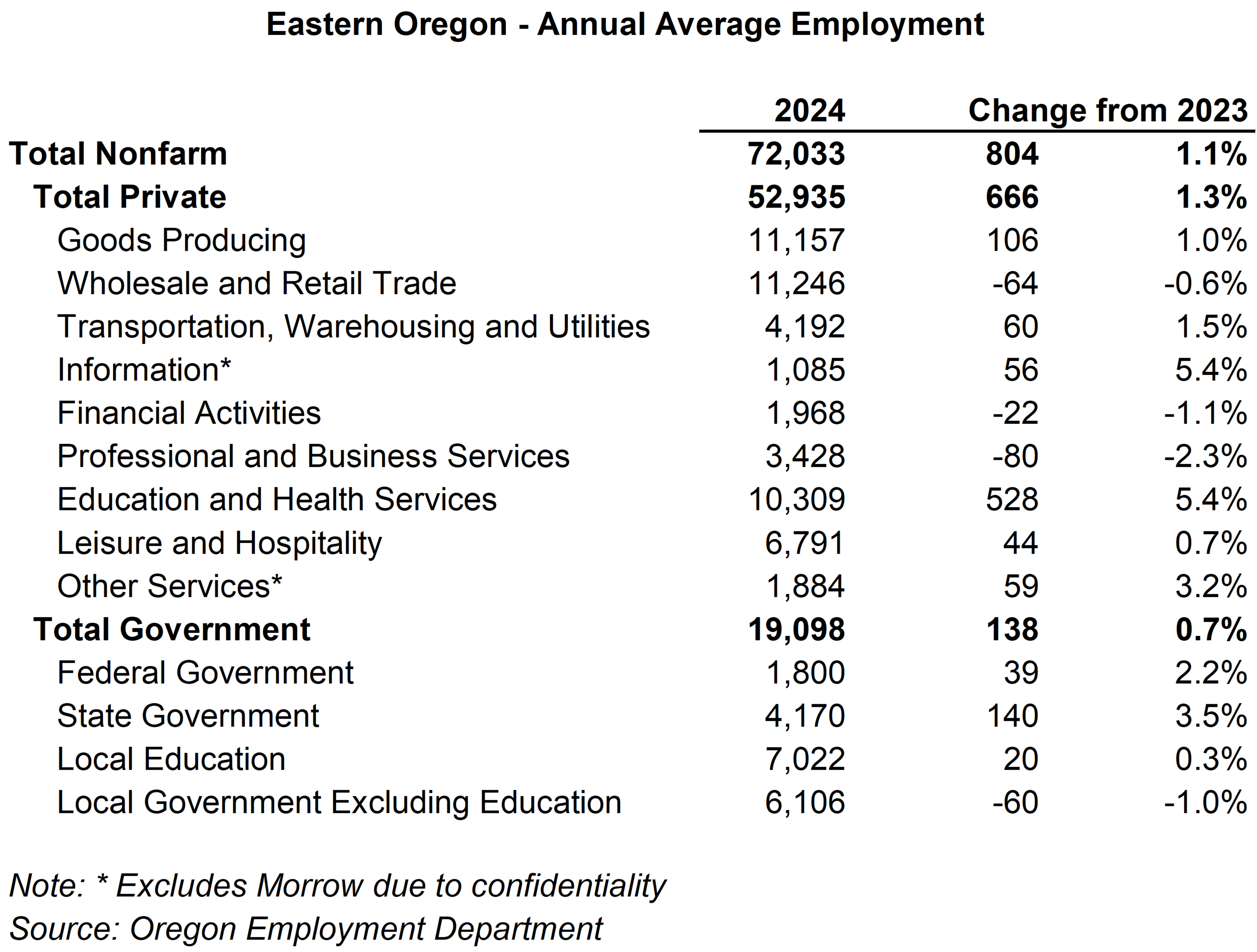 June 10, 2025Total nonfarm employment growth in Eastern Oregon was 1.1% for 2024, down from the 1.9% growth rate one year prior. Nonfarm employment reached 72,033 jobs as both the private sector and the public sector expanded. Annual average employment data shows private-sector growth of 1.3% for a gain of 666 jobs. A sizeable gain in education and health services led the overall over-the-year gains in private industry. Meanwhile, the public sector grew by 0.7% for a gain of 138 jobs, led by a significant gain in state government.