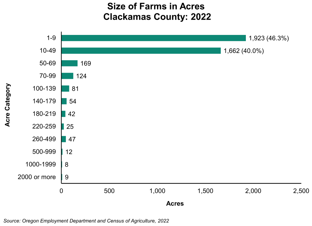 In 2022, the average size of a farm in Clackamas County was 38 acres and over four-fifths or 3,585 farms were under 50 acres. The largest farms, with 500 acres or more, totaled 29 and these farms made up only 0.7% of all farms in the county.