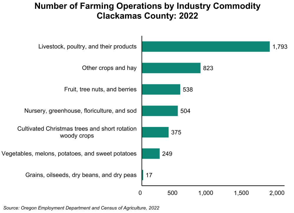 Agricultural commodities are defined as crops and livestock that are raised and harvested to provide food and sometimes fuel and are often traded globally. During 2022 in Clackamas County, the two largest types of farming operations (by industry) were in the livestock, poultry, and their products industry (1,793) and other crops and hay (823). The county also had significant numbers of farmers producing fruit tree nuts, and berries (538) and nursery, greenhouse, floriculture, and sod (504). A smaller number of farms produced cultivated Christmas trees and rotation woody crops (375); vegetables, melons, potatoes, and sweet potatoes (249); and grains, oilseeds, dry beans, and dry peas (17).
