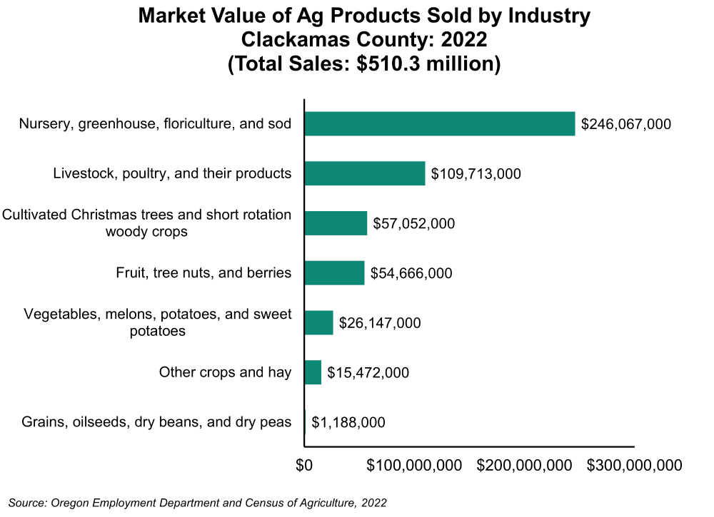 The current dollar market value of all agricultural products sold in Oregon during 2022 totaled $6.8 billion – up from $5.0 billion in 2017. In Clackamas County, the market value of all agricultural products totaled $510.3 million in 2022 – up from $376.3 million in 2017. Two agricultural industries in the county produced over two-thirds of the total value of agricultural products sold during 2022. They included nursery, greenhouse, floriculture, and sod industry at $246.1 million (48.2%) and livestock, poultry, and their products industry at $109.7 million (21.5%).