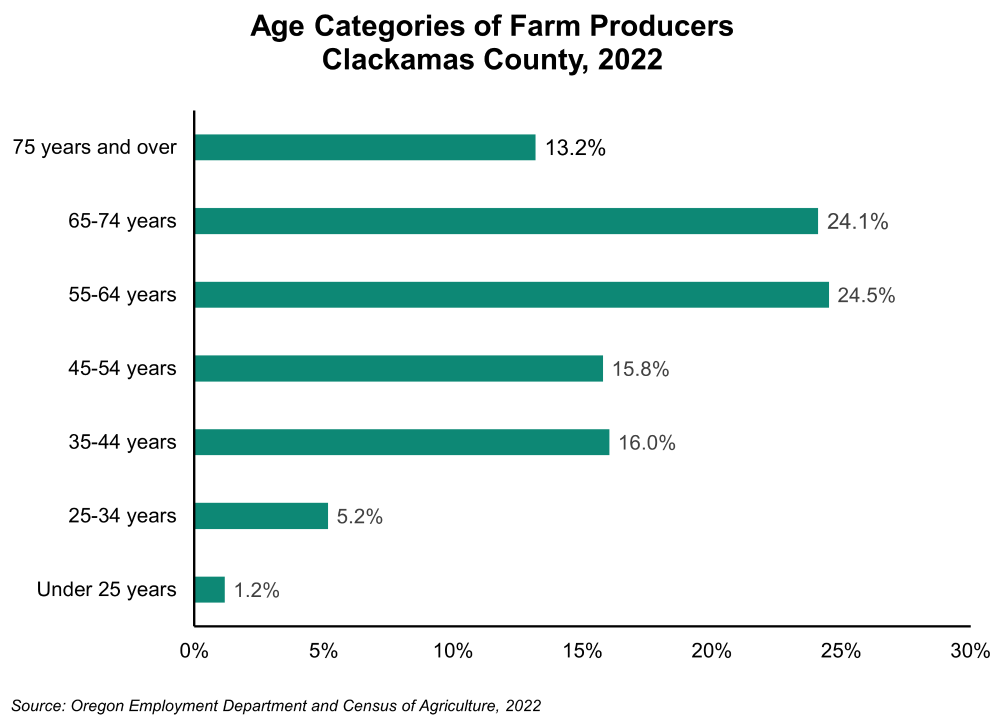 In 2022, Clackamas County had the highest number of total producers of all counties in Oregon at 8,177. The gender mix of producers was 54.7% male and 45.3% female. Nearly two-thirds (62%) of farm producers were 55 years or older in 2022 and the average age was 58 years. The county’s younger and future generation, those under 25 to 34 years, made up only 6.4% of all producers in 2022 – relatively unchanged from 6.8% in 2017.