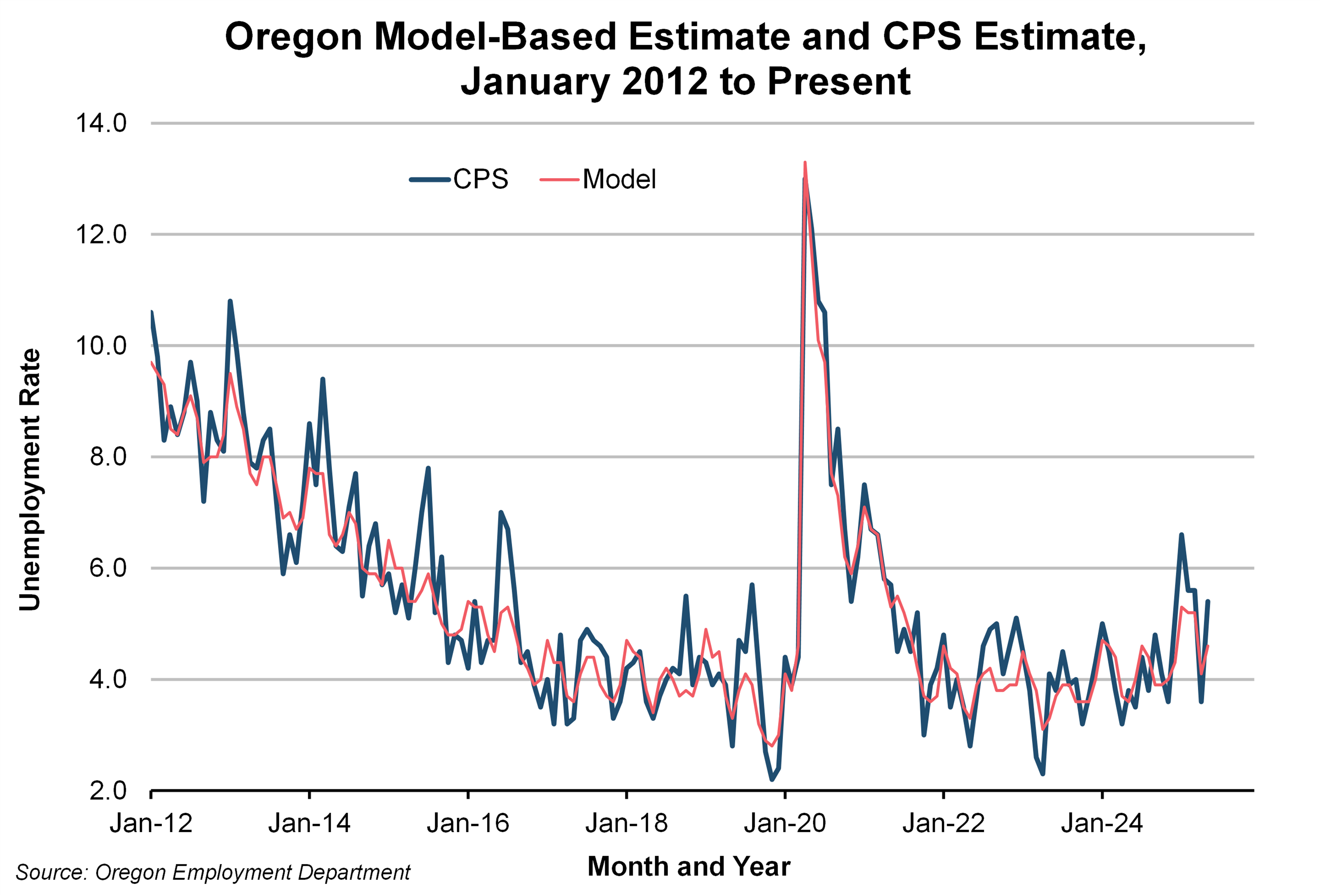 The first graph contains CPS unemployment rate data by month from January 2012 to the present and illustrates the important characteristics of CPS survey error. Wide month-to-month swings in CPS data make it difficult to discern real labor market changes from survey error, or “noise.” For this reason, CPS data are not published. Econometric time series models are applied to state CPS data to minimize the impact of survey error on published labor force data for Oregon.