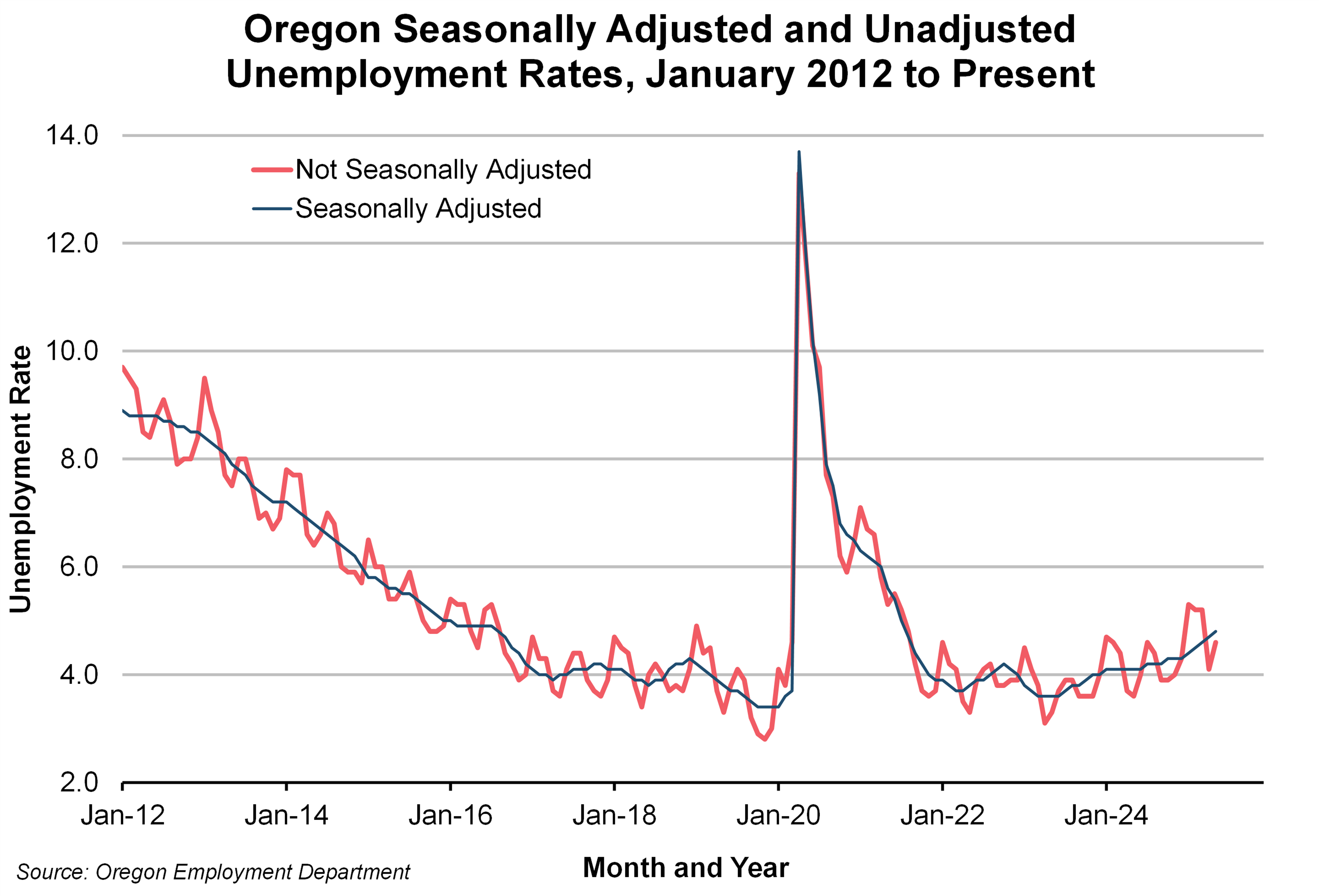 The time series models behind Oregon’s employment and unemployment data are designed to produce seasonally adjusted data. The models of the signal are written as a combination of trend, seasonal, and irregular components. Subtracting the seasonal component provides Oregon’s seasonally adjusted unemployment rate. The seasonally adjusted unemployment rate cuts through the center of the unadjusted series, thereby revealing the underlying trend in unemployment that is obscured by the recurring seasonal peaks and troughs.