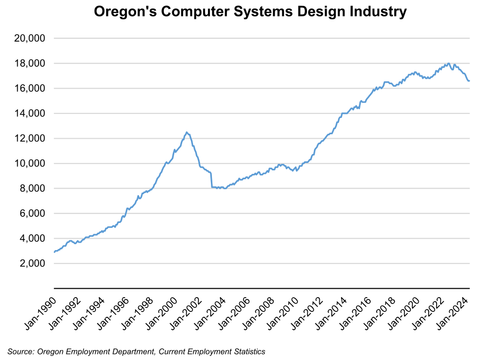The decade from 1990 to 2000 was a period of strong job growth in Oregon and especially for the computer systems design industry. While employment in Oregon overall grew by 31%, the computer systems design industry added 8,400 jobs for a growth rate of roughly 260%, reaching 11,600 jobs.