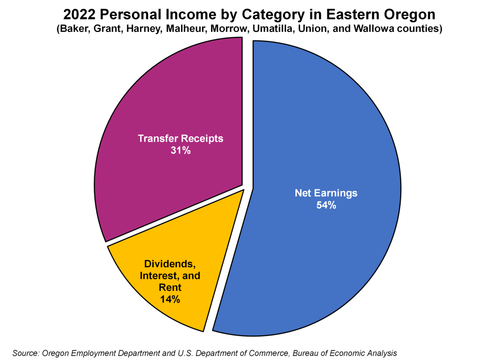 Net earnings made up 54% of Eastern Oregon’s total personal income in 2022, while transfer receipts made up 31% and dividends, interest, and rent accounted for 14%. This is a significant change from 2012, when net earnings made up 55% of the area’s personal income and transfer receipts made up only 28% with dividends, interest, and rent accounting for 17%.