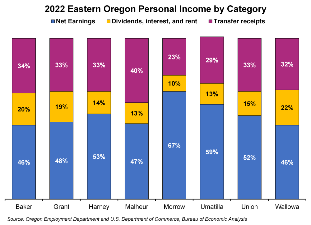 Morrow and Umatilla County residents had a higher percentage of their total personal income from net earnings, at 67% and 59%, respectively, while Harney (53%), Union (52%), Grant (48%), Malheur (47%), Baker (46%), and Wallowa (46%) all have much lower shares.