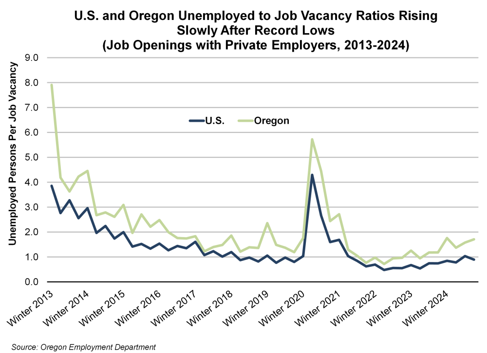 Graph showing U.S. and Oregon unemployed to job vacancy ratios rising slowly after record lows