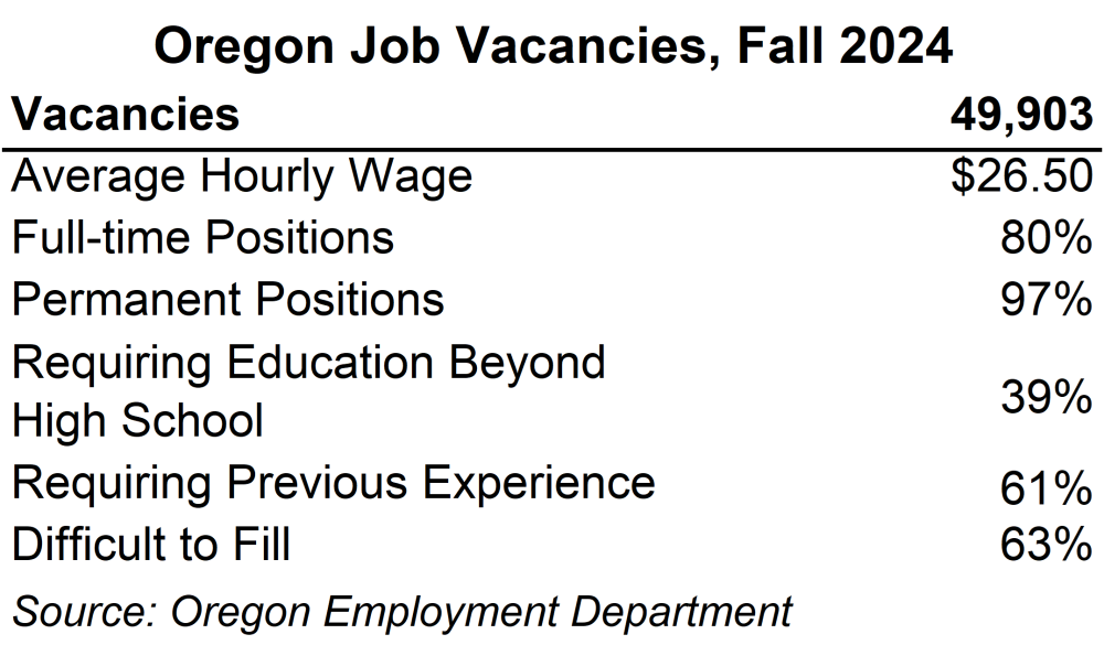 Most Oregon openings in the fall were for full-time, permanent positions. Education beyond high school was required for 39% of fall vacancies. Prior work experience was required for 61% of vacancies, up from 57% in fall 2023. Employers reported a majority of their vacancies as difficult to fill, accounting for 63% of vacancies in fall 2024.