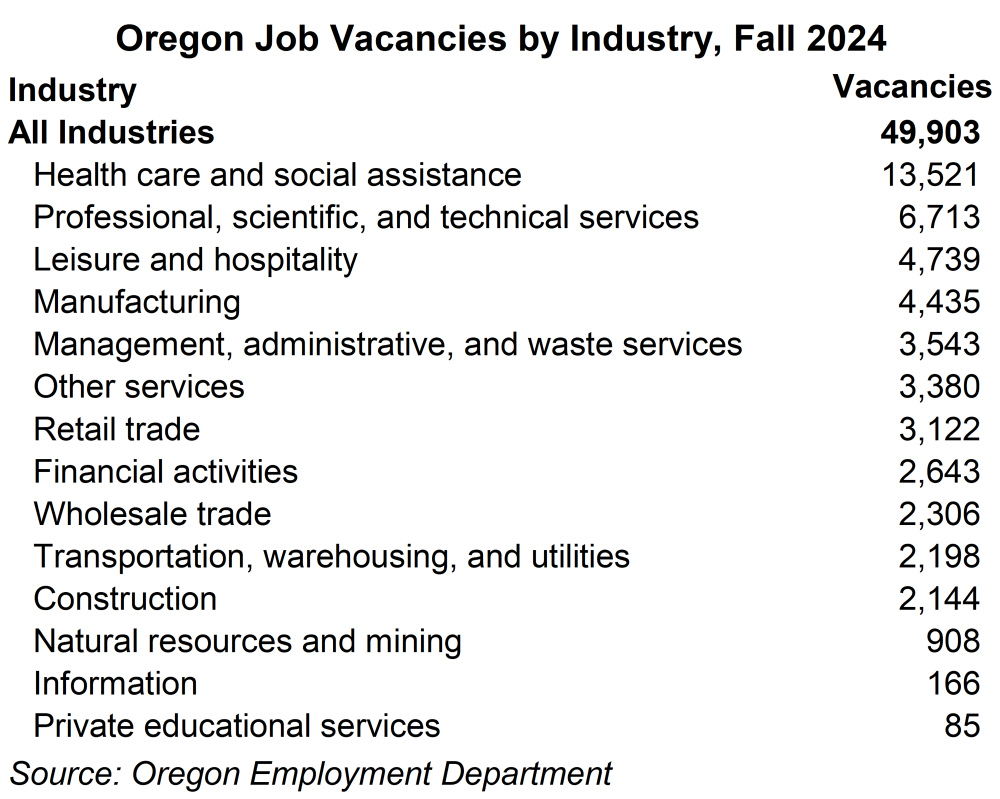 Each quarter, the Oregon Employment Department surveys private employers from all industries and areas of the state to ask about the job vacancies they are actively trying to fill. Oregon businesses reported 49,900 vacancies in fall 2024. Vacancies decreased 18% from the summer and decreased 23% from fall 2023. After reaching elevated levels of close to 100,000 job vacancies in spring 2021 through summer 2022 in the rapid hiring following pandemic re-openings, fall 2024 is the lowest level of job vacancies seen in Oregon since summer 2020 and the lowest fall level since 2015.