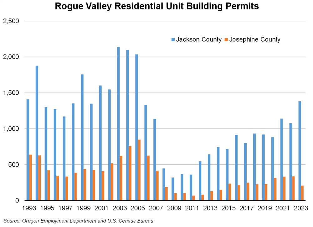 In the Rogue Valley, residential permits have ranged between about 1,475 and 1,600 units from 2021 to 2023. While above the low point of around 500 annual residential permits issued in the 2009-2010 period, the level most recently is far below the 2,700 to 2,880 or so residential permits issued back in the housing boom era of 2003-2005. During the first seven months of 2024, year-to-date totals show the Rogue Valley on a similar pace for residential building permit issuances as in 2023. Part of the recent uptick in residential building activity is related to the recovery from the Almeda fire. The Phoenix and Talent cities’ share of Jackson County building permits ranged between about 2% and 10% of the county’s annual residential building permits from 1993 to 2019. In 2022, those two towns accounted for about one-quarter of Jackson County’s residential building permits, when Phoenix and Talent totaled 251 residential permits.