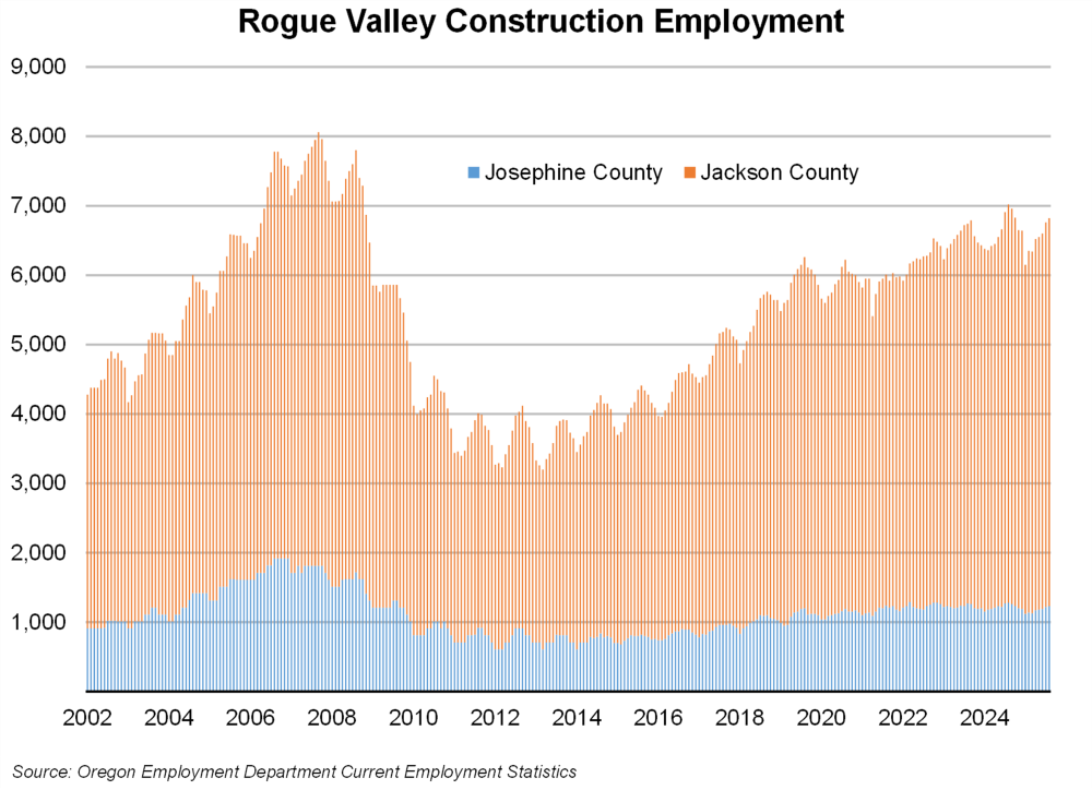Recently, construction employment reached a peak of about 7,000 jobs in August 2023 and is down about 180 jobs as of August 2024, at 6,820 payroll construction jobs in the Rogue Valley. Even with the steady gains, August 2024 construction employment in the Rogue Valley was about 1,130 jobs below the total reached in August 2006.