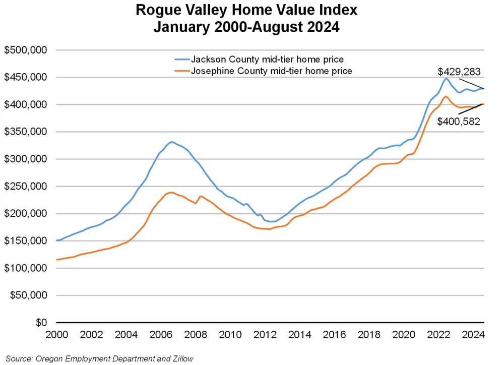 Another rich source of local real estate, home sales, and price data is available from the Southern Oregon Multiple Listing Service. Visit their statistics page for Rogue Valley market summaries and reports. In the July through September 2024 period there were 559 urban homes sales in Jackson County, down from 578 the same period one year before. Josephine County urban sales were little changed from 153 to 149 over that time. Median existing home sales price during the July through September 2024 period rose by 10% from the same time in 2023 in Jackson County and by 2.6% in Josephine County. Jackson’s median existing home sales price was $400,000 while Josephine’s median urban home sales price was $380,000. The average time a home spent from listing to a pending sale also rose during that time, from 18 to 24 days in Jackson County and from 19 to 36 days in Josephine County. During the past year, inventory of homes for sale increased. On Sep. 30, 2024 there were 842 homes listed for sale, up from 733 homes one year earlier. Josephine County inventory rose from 354 to 414.