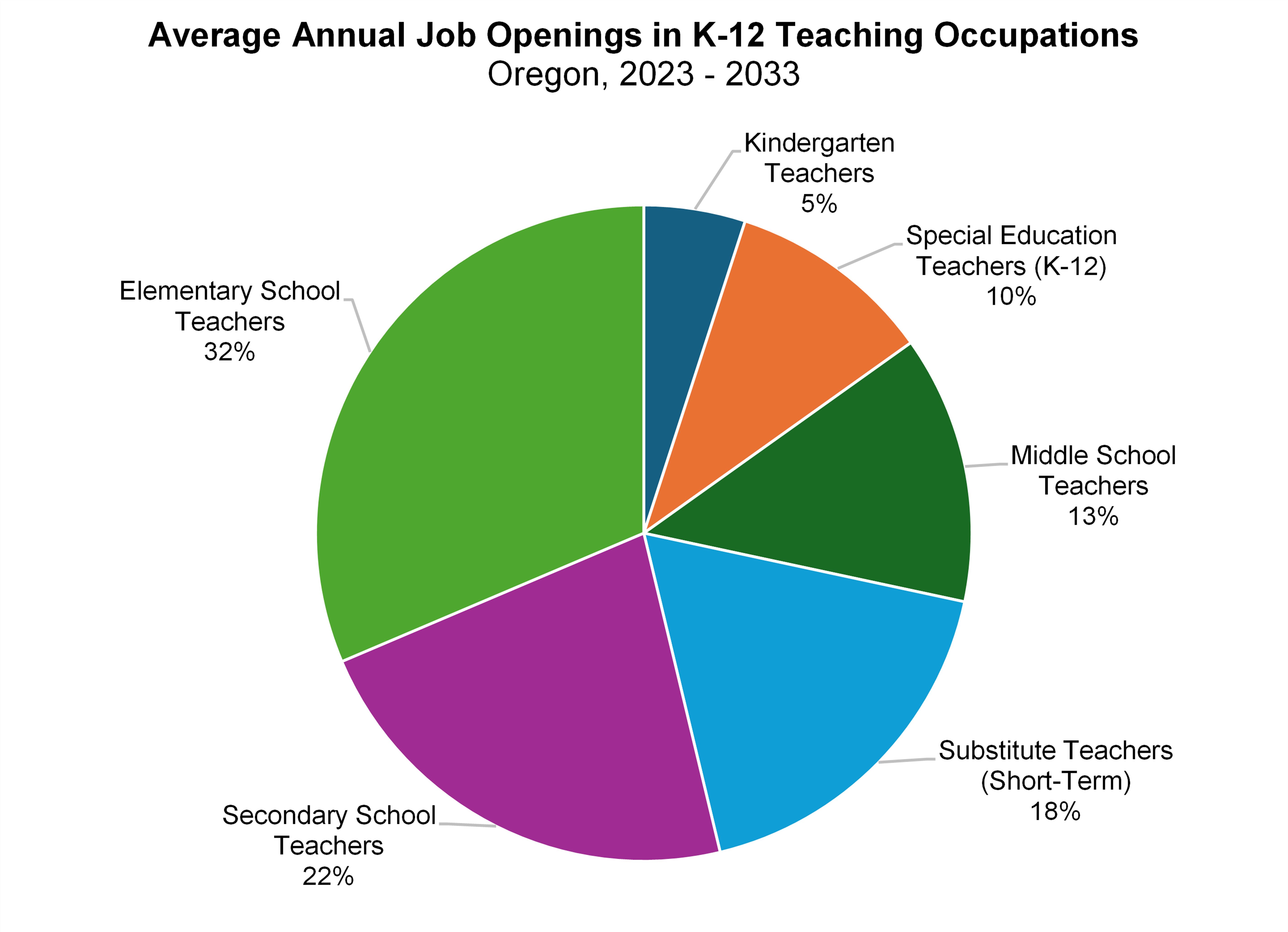 The great news for those looking to become a certified elementary or secondary school teacher in Oregon, is that these are large occupations with above average projected annual openings and various grade level or subject area specializations to choose from. Find a setting that aligns with your passions and teaching could be a fulfilling, sustainable occupation with high societal impact over the course of a career.