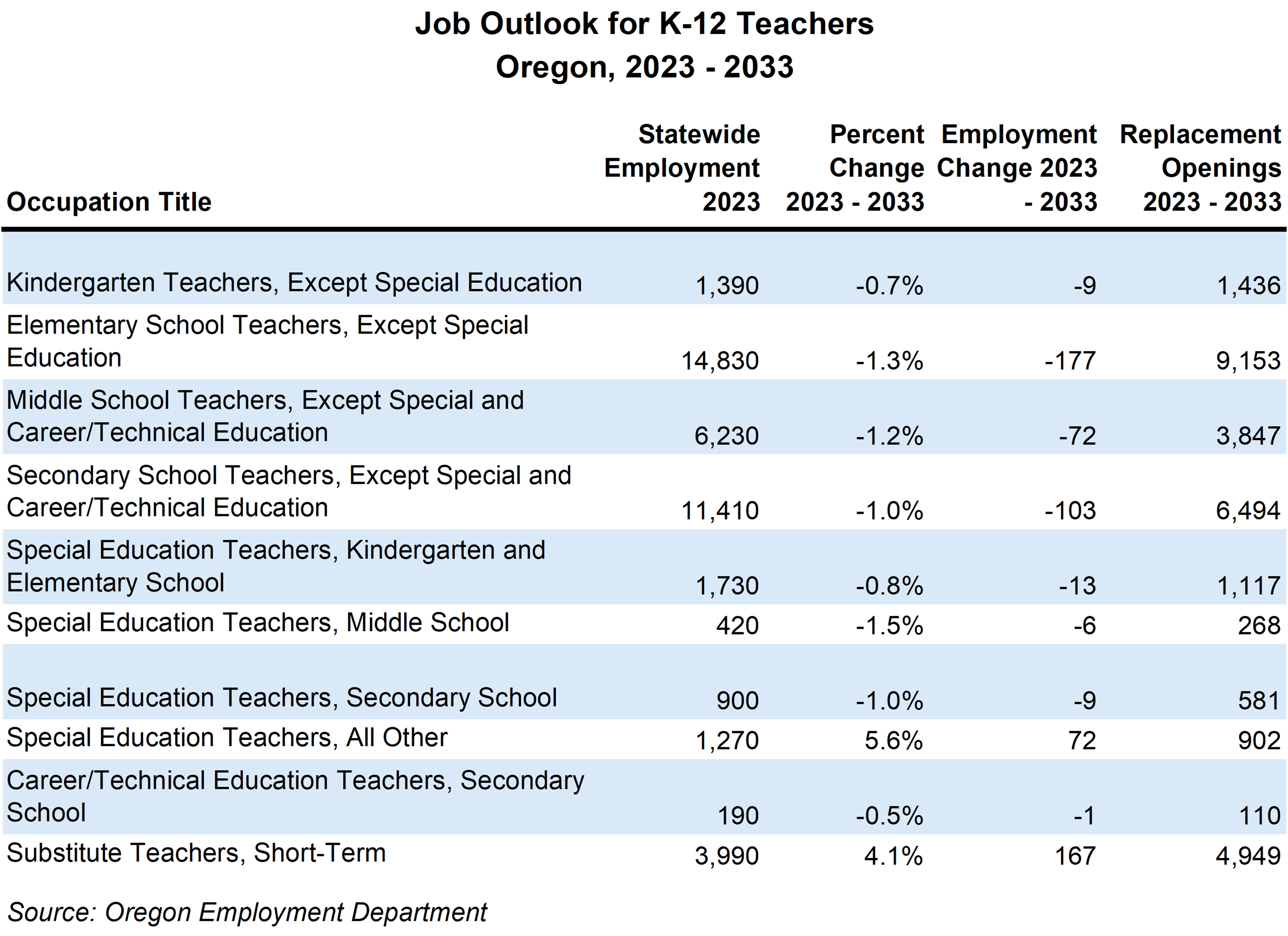 Declining school enrollment should not be a cause for alarm for future teachers hoping to join the workforce. They will still have strong job prospects upon graduation as older teachers retire and others exit the profession due to individual factors. In recent years, several school districts have encountered high rates of teacher attrition and found it necessary to actively recruit new teachers or improve their retention strategies. Some notable areas of job growth are for substitute teachers and for special education teachers at the regional education service districts (ESDs), which are projected to grow 4.1% and 5.6%, respectively. The Employment Department projects there will be around 28,700 job openings for K-12 teachers during the next decade, or 2,870 per year.