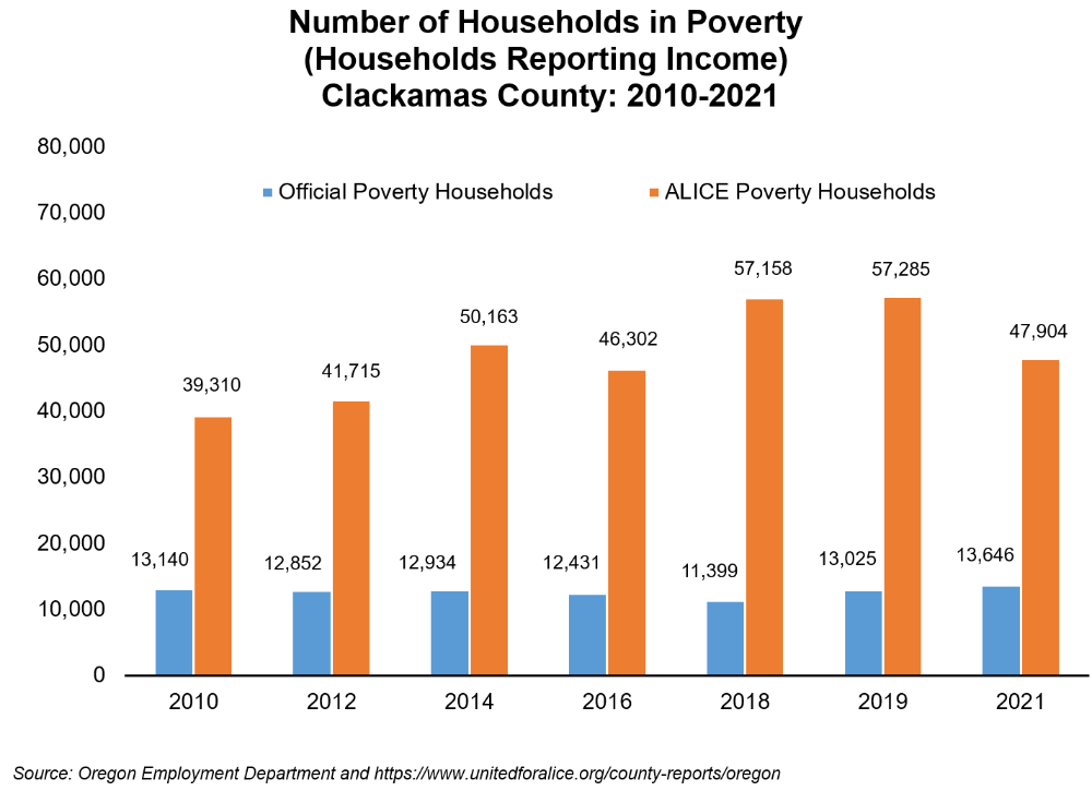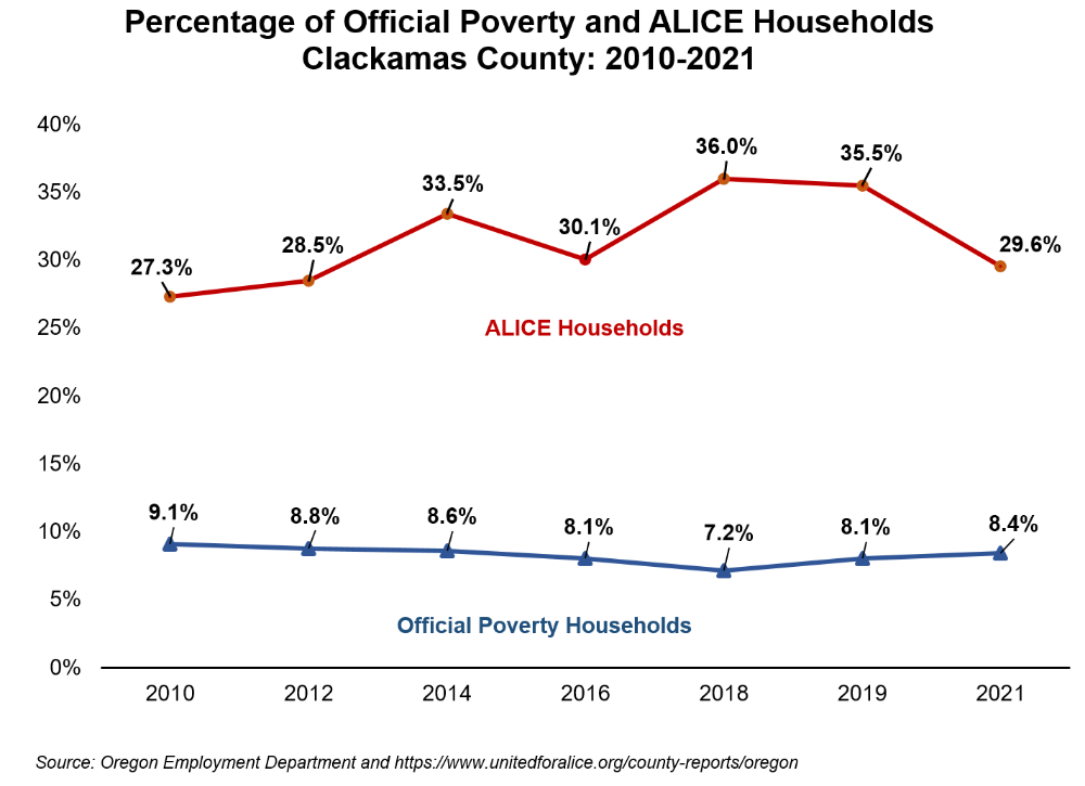 According to UnitedForALICE.org, the number of households in financial hardship in Oregon continues to be undercounted by official measures. According to the official poverty measure, 12% of Oregon households were in poverty in 2021 while ALICE data shows that another 32% were ALICE poverty households.