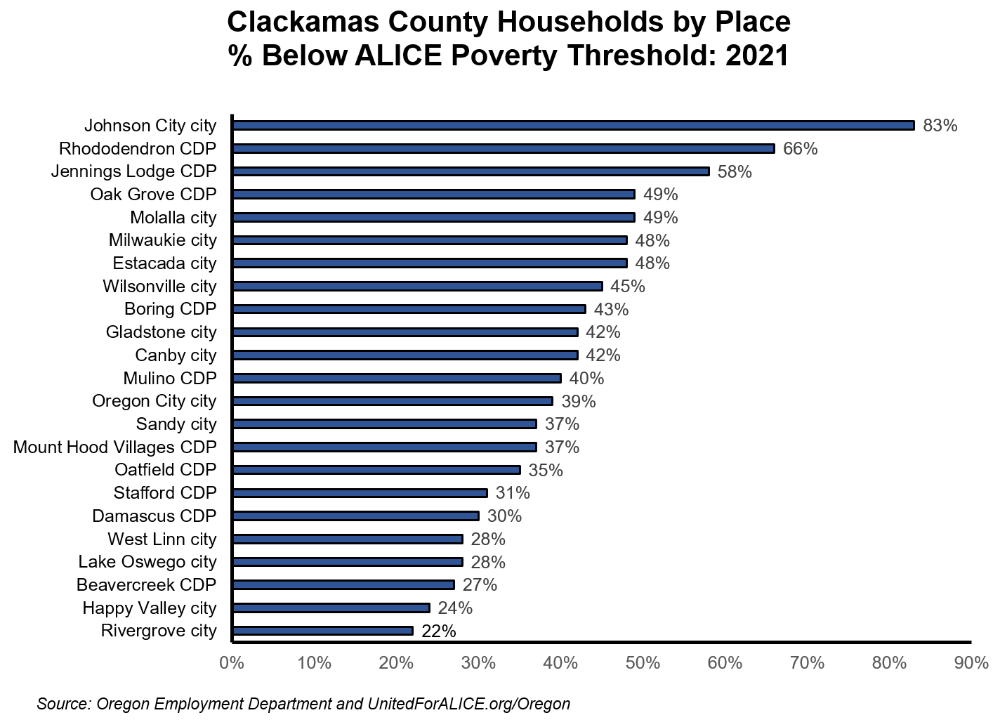 There is a wide range of ALICE poverty thresholds among both incorporated and unincorporated places in Clackamas County in 2021. The largest shares below the ALICE poverty thresholds were seen in Johnson City at 83% (population 537), Rhododendron CDP at 66% (population 173), and Jennings Lodge CDP at 58% (population 7,953). The lowest poverty thresholds were seen in Rivergrove at 22% (population 552), Happy Valley at 24% (population 25,738), and Beavercreek CDP at 27% (population 4,026).