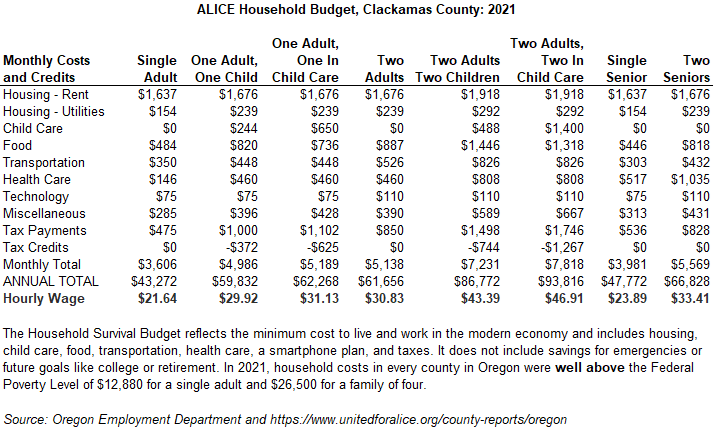The ALICE House Survival Budget estimates the bare-minimum cost to live and work in an economy in each state and county in the U.S. The ALICE Budget is made up of conservative estimates for the cost of household essentials including housing, child care, food, transportation, health care, technology, miscellaneous expenses, and taxes. The ALICE household budget for 2021 in Clackamas County estimated that the minimum (living) hourly wage for a single person household with no children was $21.64 an hour or $43,272 a year. Additionally, the minimum living wage for one adult household with one child in childcare rose to $31.13 an hour or $62,268 a year.