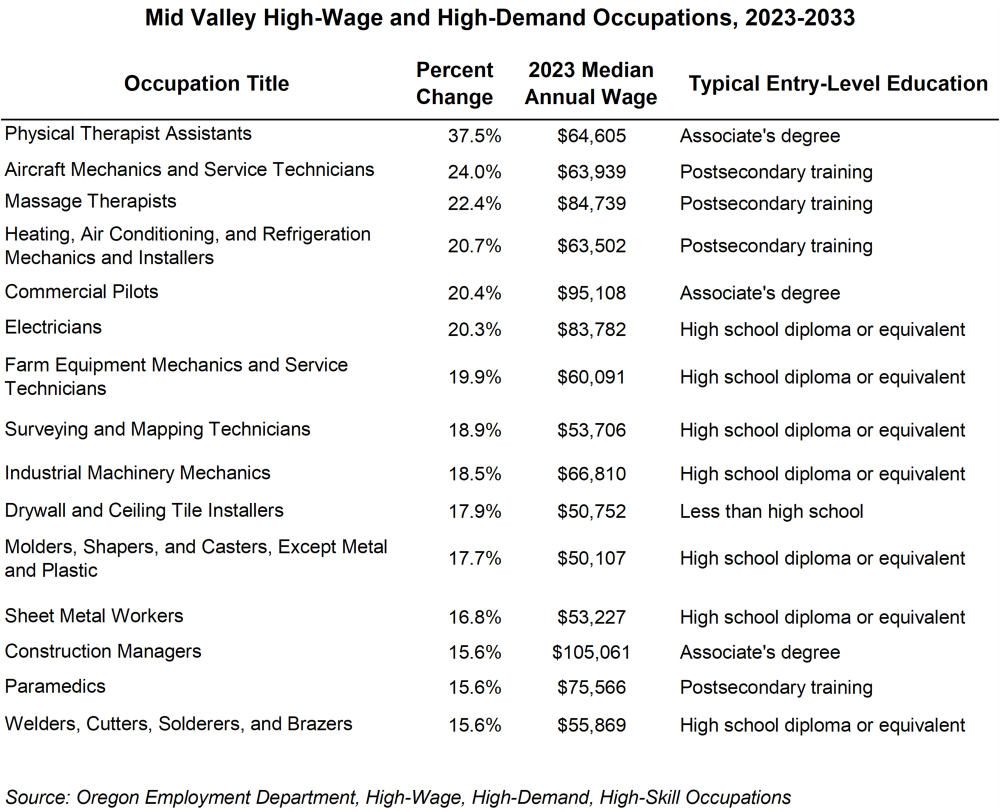 Mid-Valley High-Wage and High-Demand Careers with Alternative Pathways