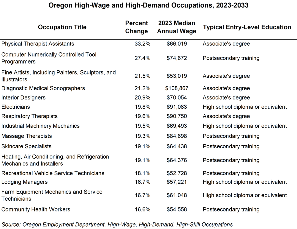 The table above showcases the top 15 high-wage, high-demand jobs in the Mid-Valley area that don’t require a bachelor’s or master’s degree, offering exciting career opportunities for those with postsecondary training. The fastest-growing position is physical therapist assistant, which requires an associate’s degree and offers a median salary of $64,605. In addition, fields like health care, skilled trades, and manufacturing provide rewarding career paths for individuals with the right training.