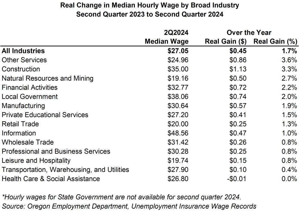 Most industries had real wage gains, meaning that the median wage increased more than inflation. Other services had the largest real gain in median wage percentage growth from second quarter 2023 to second quarter 2024 (3.6%), followed by construction with 3.3% wage growth over the year.
