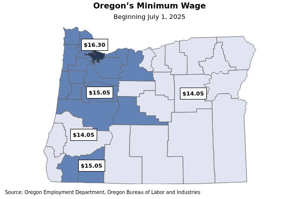 Oregon’s minimum wage increases on July 1, 2025 and the raises will not be the same across the state. The minimum wage increases to $16.30 per hour inside the Portland urban growth boundary, $14.05 per hour in nonurban counties, and $15.05 in other areas of the state.