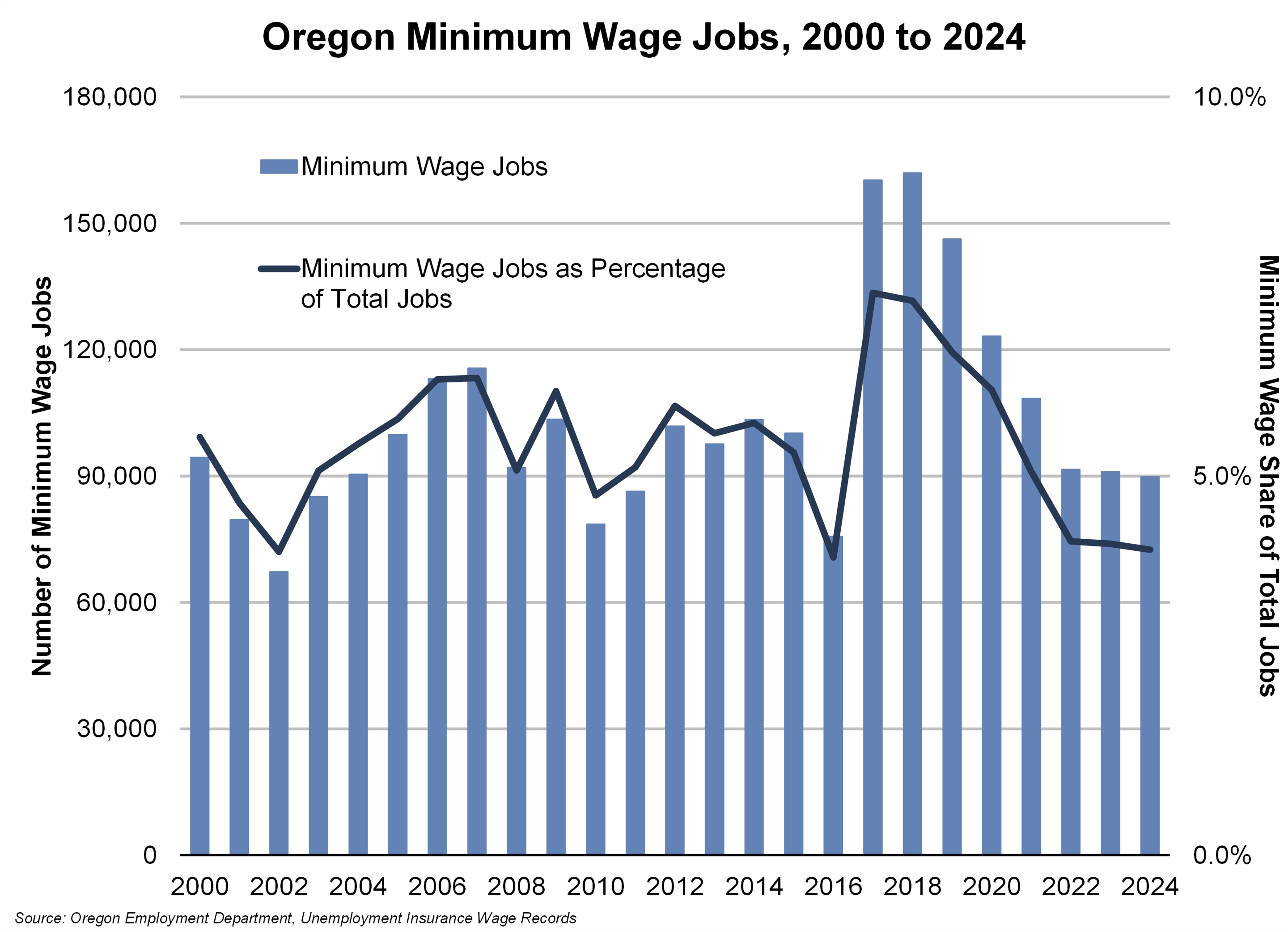 Between 2000 and 2024, minimum wage jobs in Oregon have represented about 5.4% of total jobs covered by Unemployment Insurance. This reached a peak of between 7.4% and 7.3% in 2017 and 2018, with over 160,000 minimum wage jobs each of those two years. Since then, both the share and total number of minimum wage jobs in Oregon has been declining. Over the past three years, despite annual increases in the minimum wages across the state and increases in the total number of jobs, the number and share of minimum wage jobs has stayed steady.