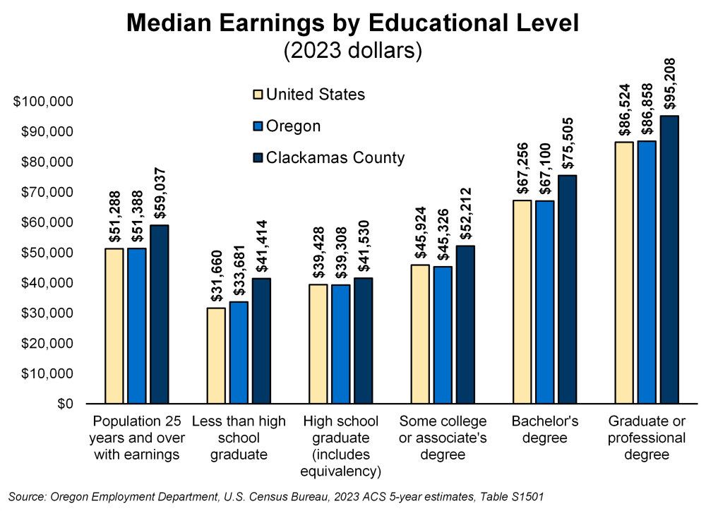 Median income or earnings is the middle value when incomes are sorted by value, representing the income level where half of wage earners earn more and half earn less. This data incorporates individuals 25 years and older, an age at which most people have completed their maximum amount of schooling. When looking at median income for the population 25 years and over, Clackamas County’s median income ($59,037) was about 13% higher than the U.S. ($51,288) and Oregon ($51,388). Median earnings were higher in Clackamas County than the U.S. and Oregon for all educational attainment levels. Higher levels of education in Clackamas County is one factor that can contribute to higher median incomes as well as the industry mix where a higher percentage of employment in an area is in higher wage industries.