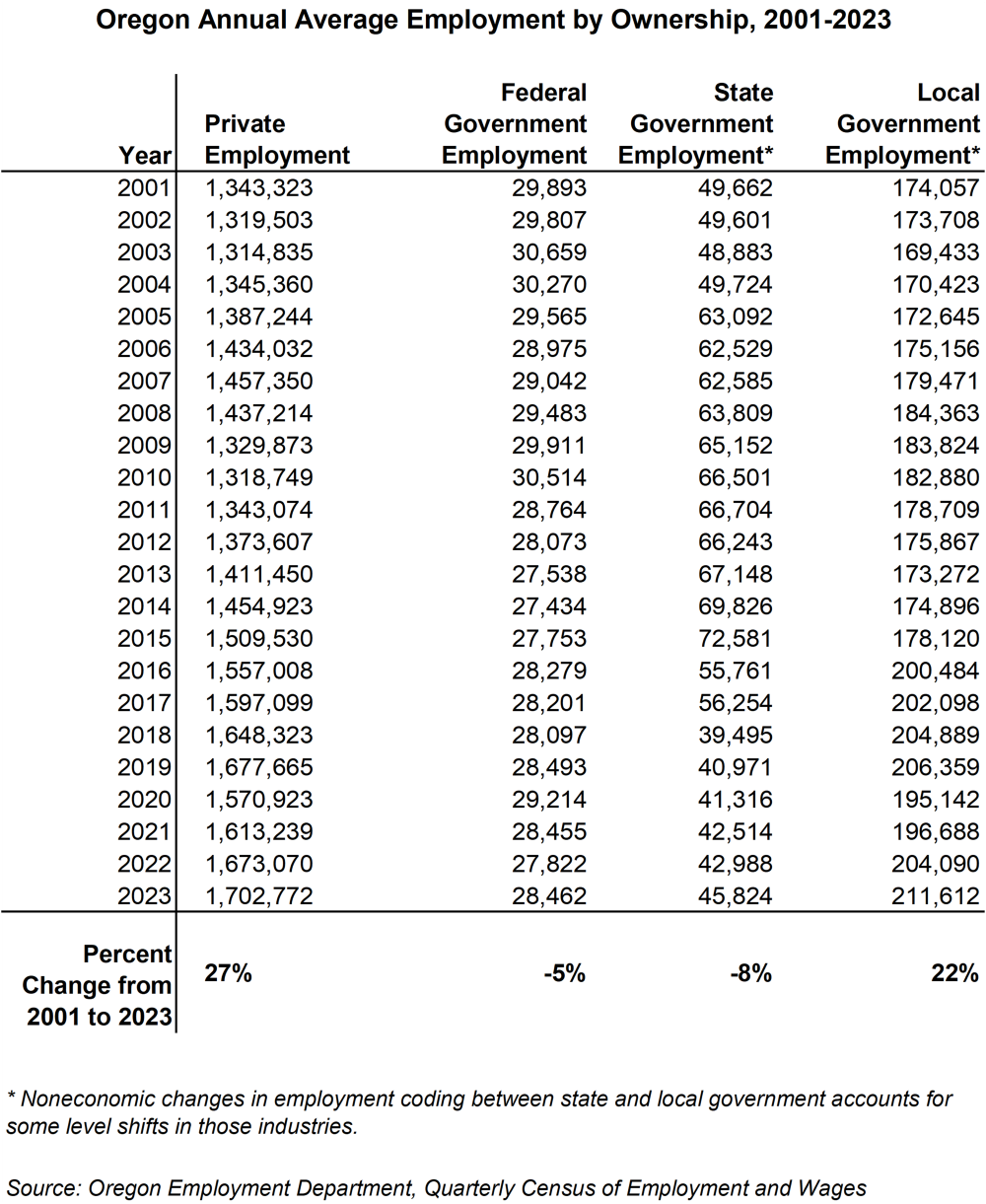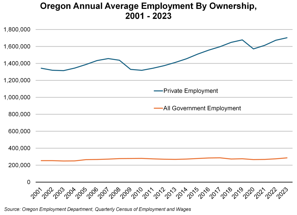 On average in 2023, Oregon employment totaled 1,988,670. About 86% of this employment was in the private sector (1,702,772 jobs), while 14% was in combined federal, state, and local government employment (285,898 jobs). Total employment in Oregon has grown 25% since 2001, but that growth has not been distributed equally across ownership. The private sector and local government in Oregon have both grown from 2001 to 2023, with the private sector growing by 27%, and local government employment growing 22%. Both federal government (-5%) and state government (-8%) have declined over the same time period.