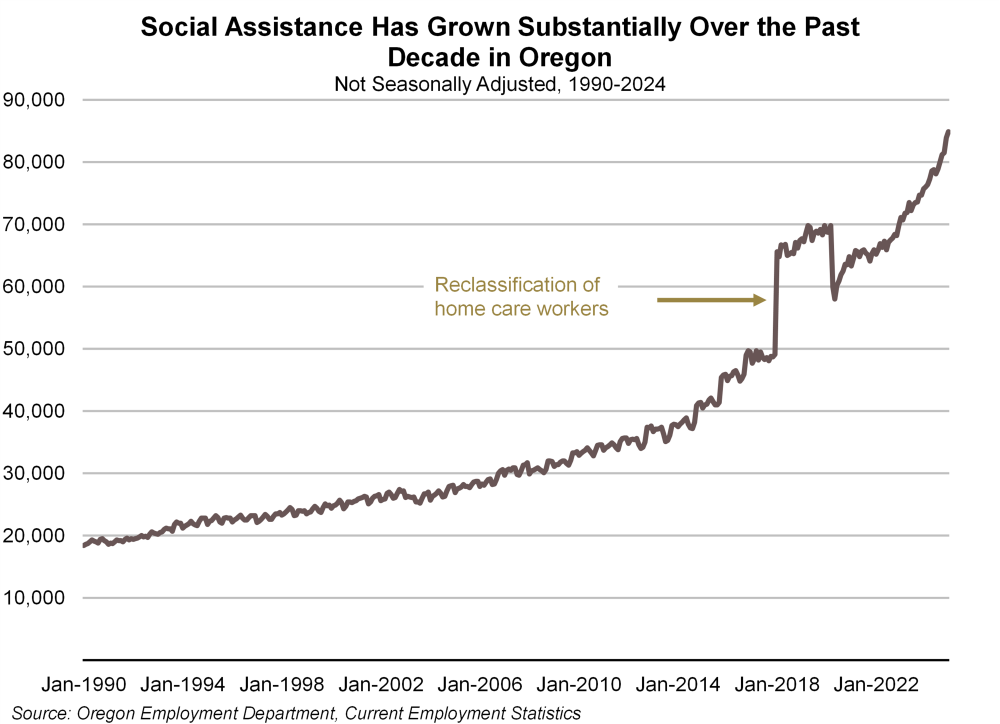 Health care and social assistance in Oregon has been growing consistently over the long term and has had some of the strongest growth over the past year in Oregon’s economy. As of December 2024, health care and social assistance grew 6.2% over the past year, which is an addition of 18,100 jobs. For context, total nonfarm employment in Oregon added 22,000 jobs (+1.1%) over the past year.