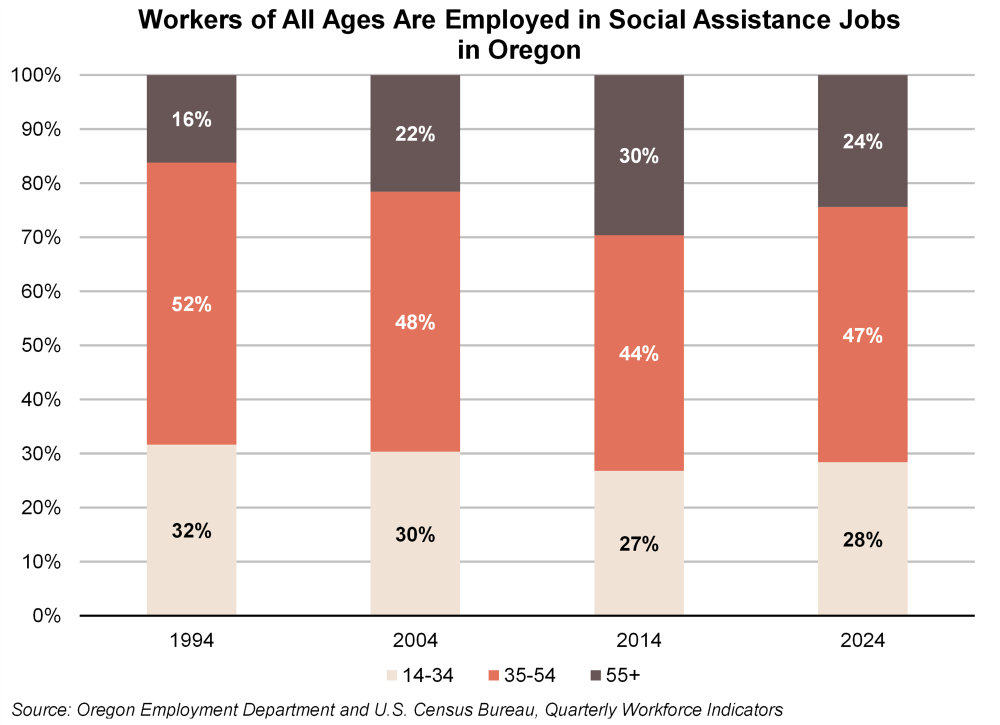 In the community food and housing, and emergency and other relief services industry, a growing share of the workforce in Oregon was ages 55 and older through 2014, before decreasing by 2024. The number of workers ages 55 and over did not decrease; instead, the number of workers who were younger than 55 increased at a faster rate.