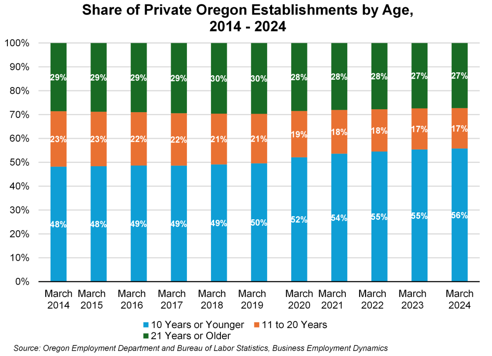 In March 2024, Oregon was home to 135,171 private business establishments which employed over 1,670,000 workers. About 21,400 of those establishments (16%) were born before March 1993 and employed 41% of all private-sector workers. On the other side of the spectrum, 15,100 private establishments were less than one year old, representing 11% of all establishments. In contrast to the oldest businesses, these young businesses only employed 3% of all private workers.