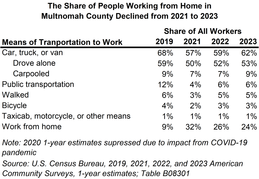March 13, 2025The COVID-19 pandemic fundamentally shifted the way people work. Workers who could worked from home and thus shifted away from other means of transportation. The share of workers living in Multnomah County who worked from home more than tripled from 2019 to 2021. In 2023, we saw many of these commuting pattern numbers trend back towards pre-pandemic patterns. Despite these changes, 2023 commuting patterns still look very different compared to 2019.