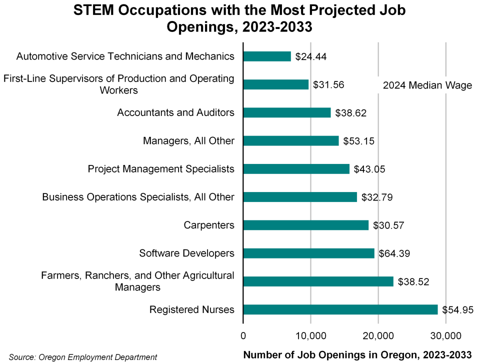 While there is an investment of time and money in education for most STEM career fields, STEM occupations generally pay well. Over 260 STEM occupations have a higher median wage than Oregon’s median wage for all occupations ($24.79 per hour) in 2024.