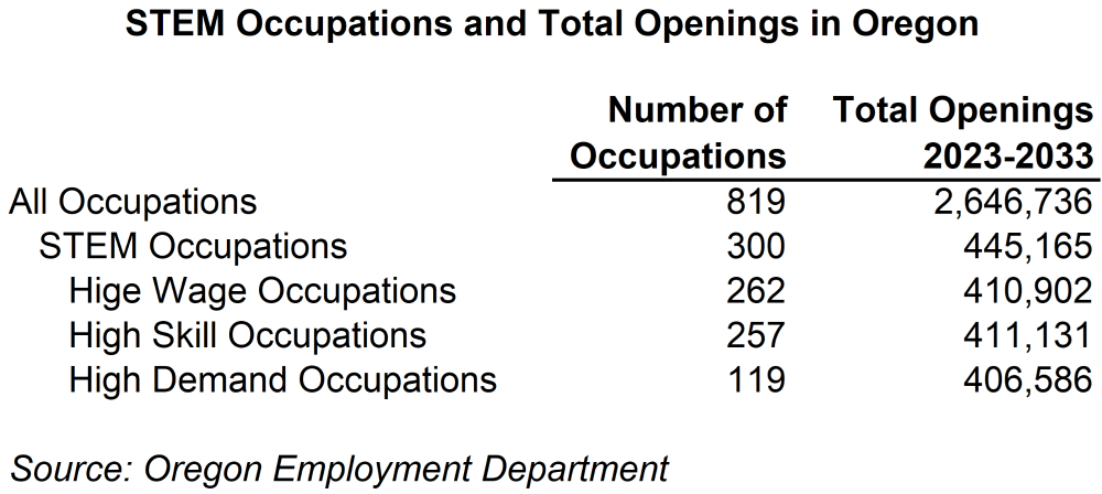 The Oregon Employment Department categorizes occupations as paying a high-wage, being in high-demand, or requiring high-skill. Most STEM occupations are high wage or high skill, and 119 occupations are high-demand occupations. A total of 97 STEM occupations are high wage, high skill, and high demand.