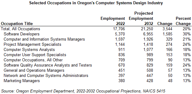 The decade from 1990 to 2000 was a period of strong job growth in Oregon and especially for the computer systems design industry. While employment in Oregon overall grew by 31%, the computer systems design industry added 8,400 jobs for a growth rate of roughly 260%, reaching 11,600 jobs.