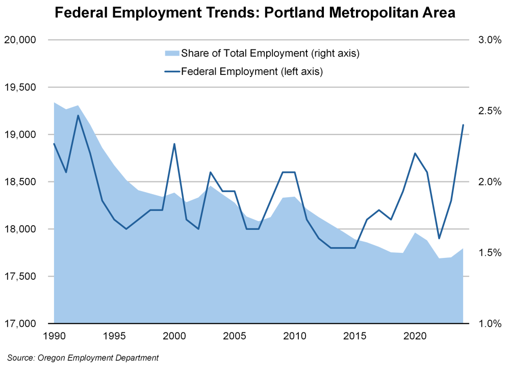 The seven-county Portland metropolitan area had about 19,100 federal government jobs in 2024, accounting for 1.5% of total employment. For perspective, our share is lower than rural Oregon (2.2%), the nation (1.9%), and the average large metro area (1.9%). The top metro areas for federal government employment, outside of Washington D.C., have large military presences (naval air stations, air force bases) or, in the case of Huntsville, Alabama, FBI headquarters. While Portland is home to several National Guard units (air and army), their footprint is small.