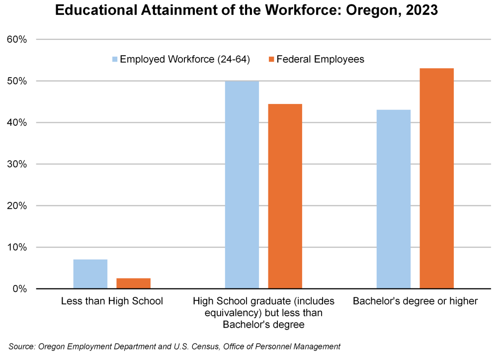 - Federal government jobs are more likely to require education beyond high school, which tends to be correlated with higher wages. For Oregon statewide, a smaller share of federal employees have less than a high school education compared with the overall employed workforce, and a greater share has a bachelor’s degree or higher.