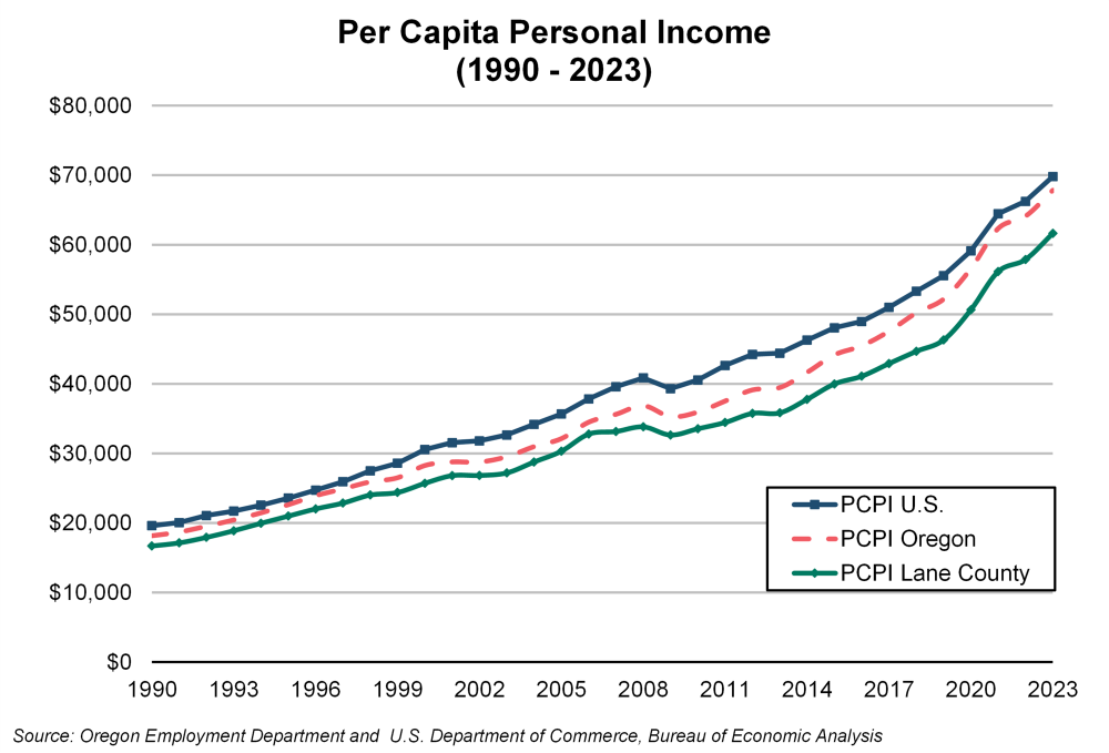 Lane County’s 2023 nominal (not adjusted for inflation) PCPI increased $3,749 (6.5%) to reach $61,634. However, when adjusted for inflation, it increased $1,786 (3.7%). In comparison, Oregon’s nominal PCPI increased $3,731 (5.8%) to reach $67,838 while its inflation adjusted (real) PCPI rose by $1,950 (3.8%). For the U.S., nominal PCPI increased $3,566 (5.4%) to reach $69,810 while its real PCPI rose $855 (1.6%). Lane County’s 2023 increase in real PCPI followed an increase of 6.2% in 2021 and a decrease of -6.9% in 2022 due to high inflation.