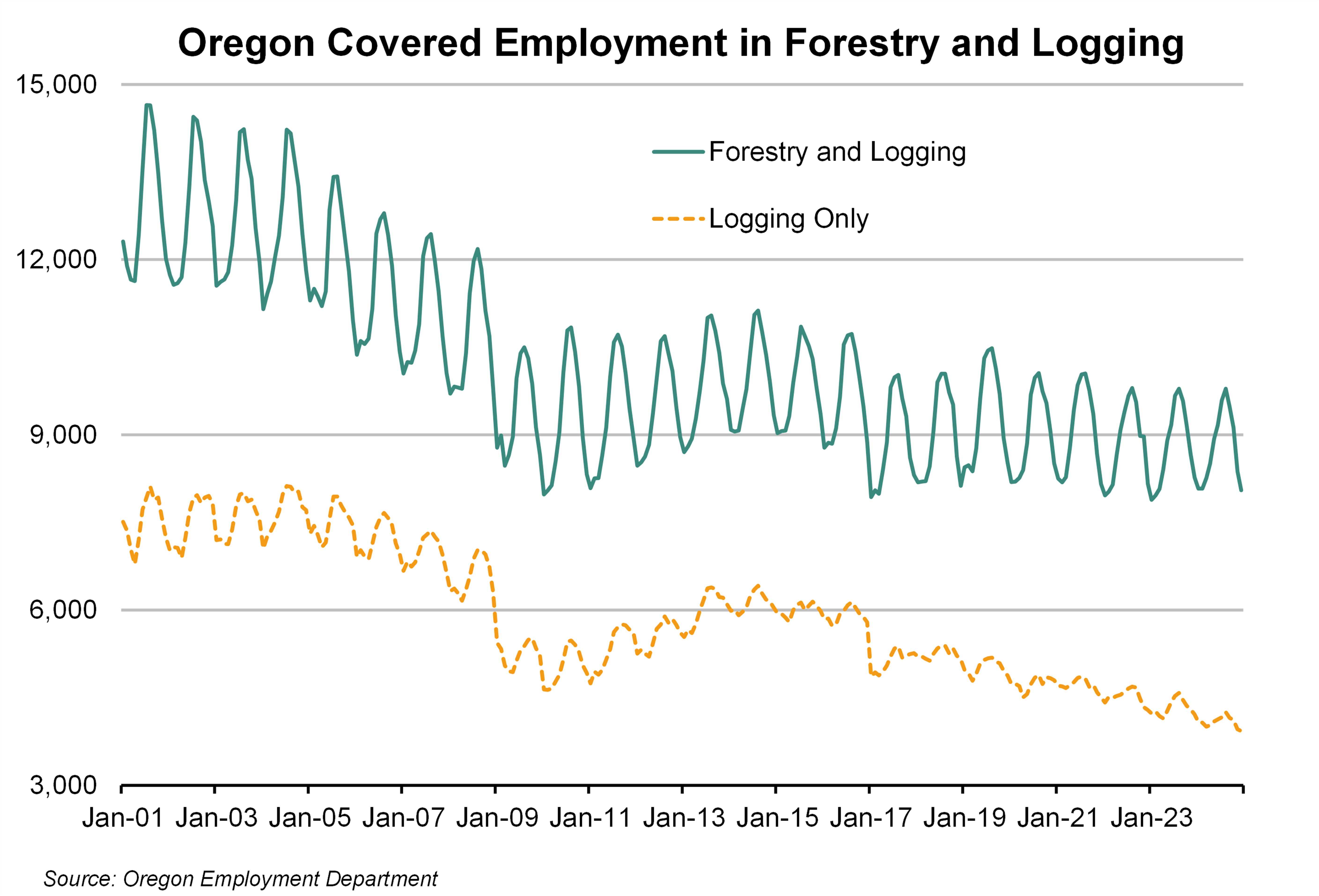 Forestry and logging is a highly seasonal industry. Employment generally grows throughout the spring and peaks in August. Employment then stabilizes for a month or two in the fall before dropping off as winter rains begin.