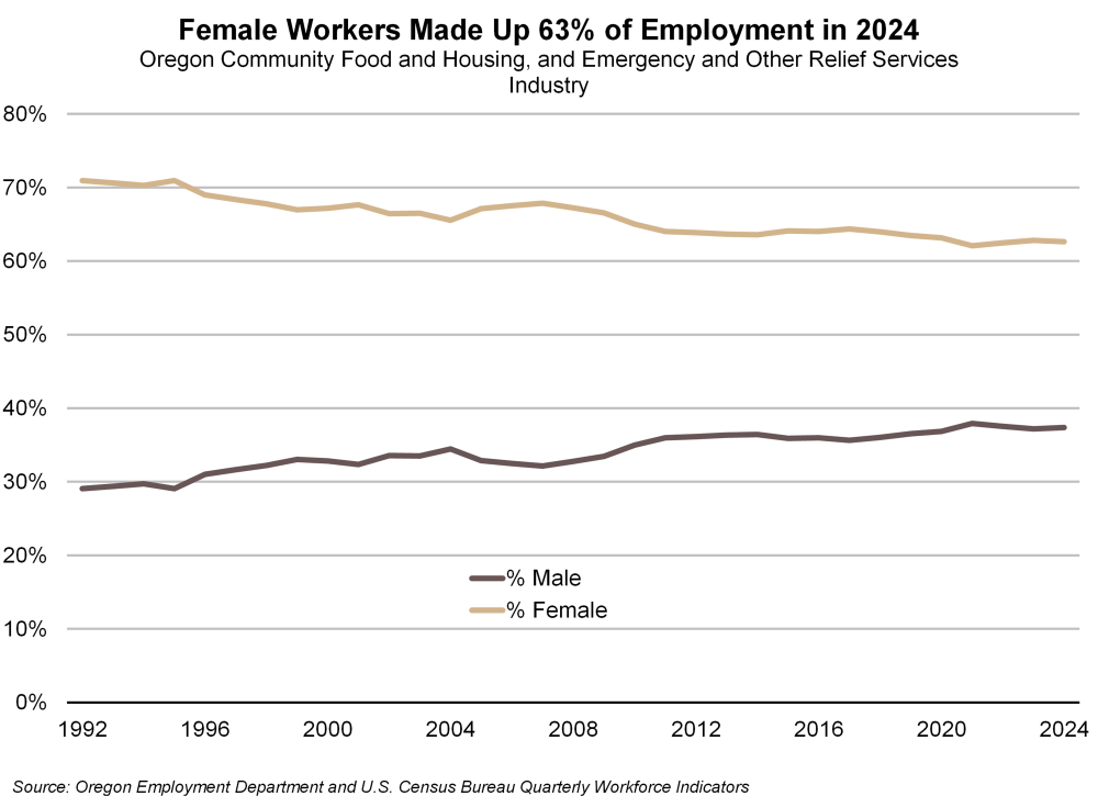 The community food and housing, and emergency and other relief services subsector tends to be female dominated. In Oregon, female workers have consistently made up between 60% to 70% of employment in this industry since 1992. The margin between female and male workers has been shrinking, but this trend is slow. In 2024, female workers were 63% of the employment in community food and housing, and emergency and other relief services.