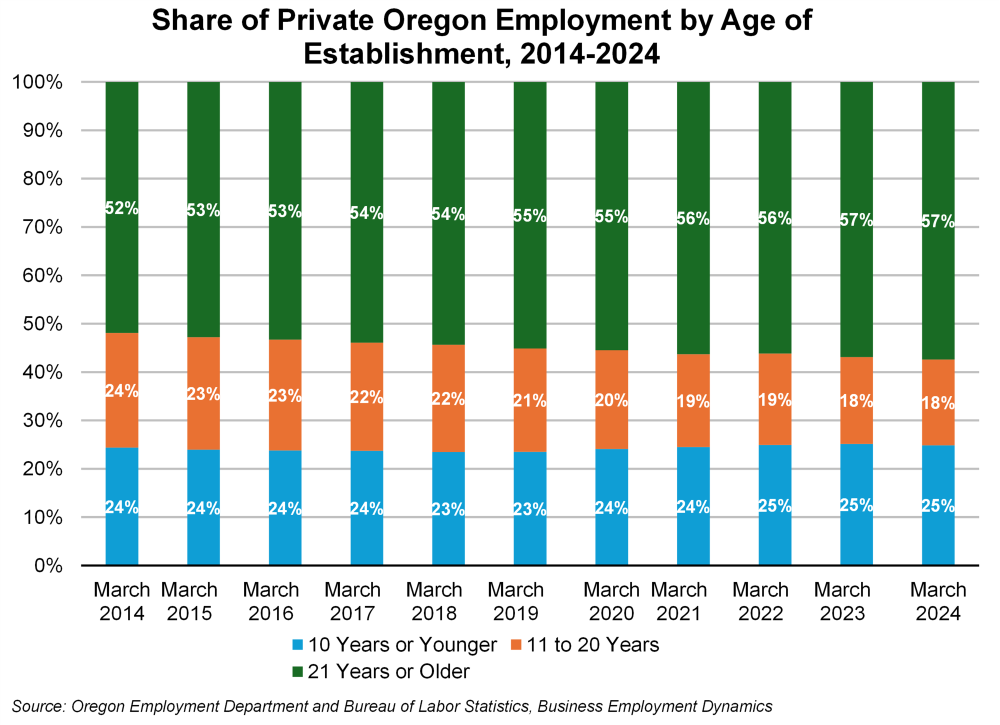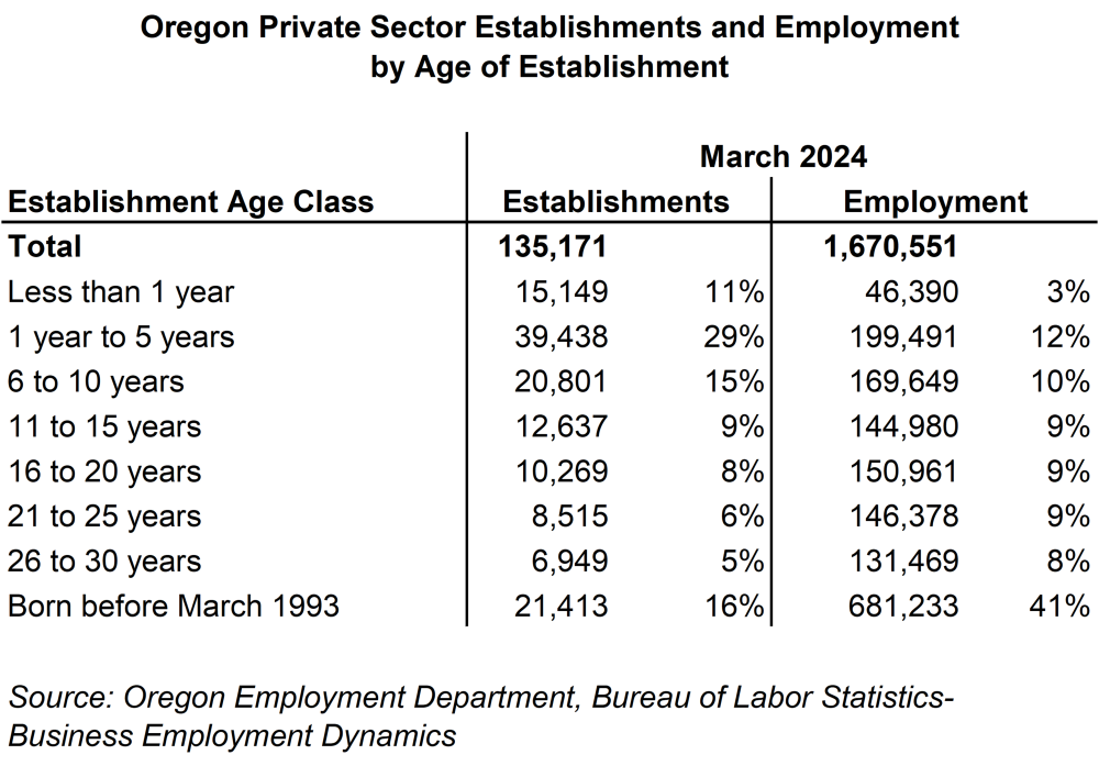 In March 2024, Oregon was home to 135,171 private business establishments which employed over 1,670,000 workers. About 21,400 of those establishments (16%) were born before March 1993 and employed 41% of all private-sector workers. On the other side of the spectrum, 15,100 private establishments were less than one year old, representing 11% of all establishments. In contrast to the oldest businesses, these young businesses only employed 3% of all private workers.