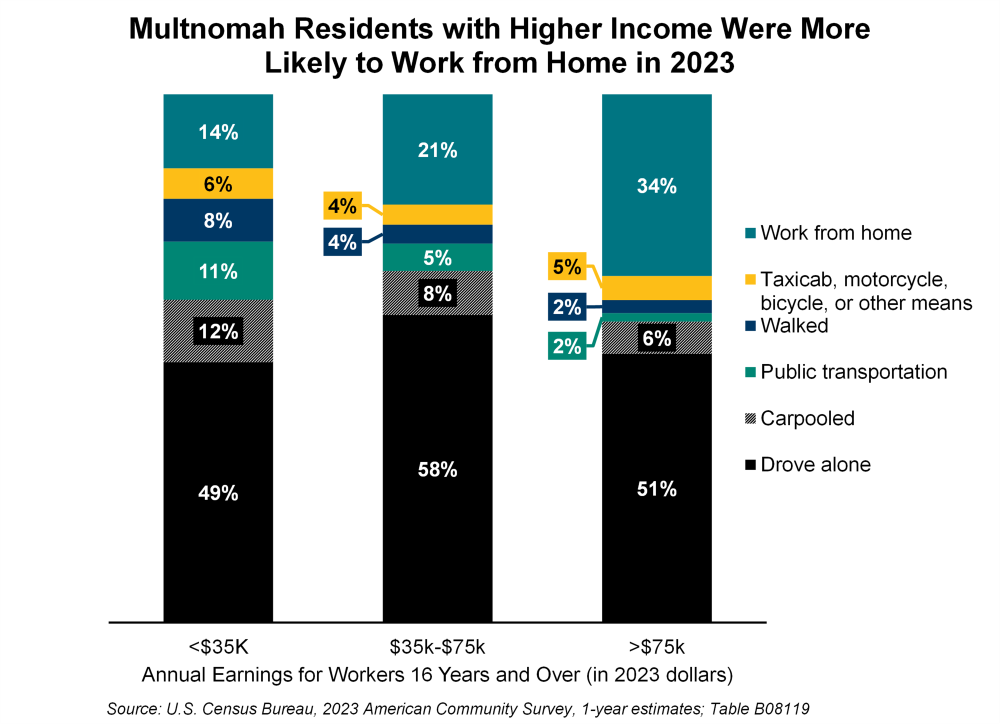 March 13, 2025The COVID-19 pandemic fundamentally shifted the way people work. Workers who could worked from home and thus shifted away from other means of transportation. The share of workers living in Multnomah County who worked from home more than tripled from 2019 to 2021. In 2023, we saw many of these commuting pattern numbers trend back towards pre-pandemic patterns. Despite these changes, 2023 commuting patterns still look very different compared to 2019.