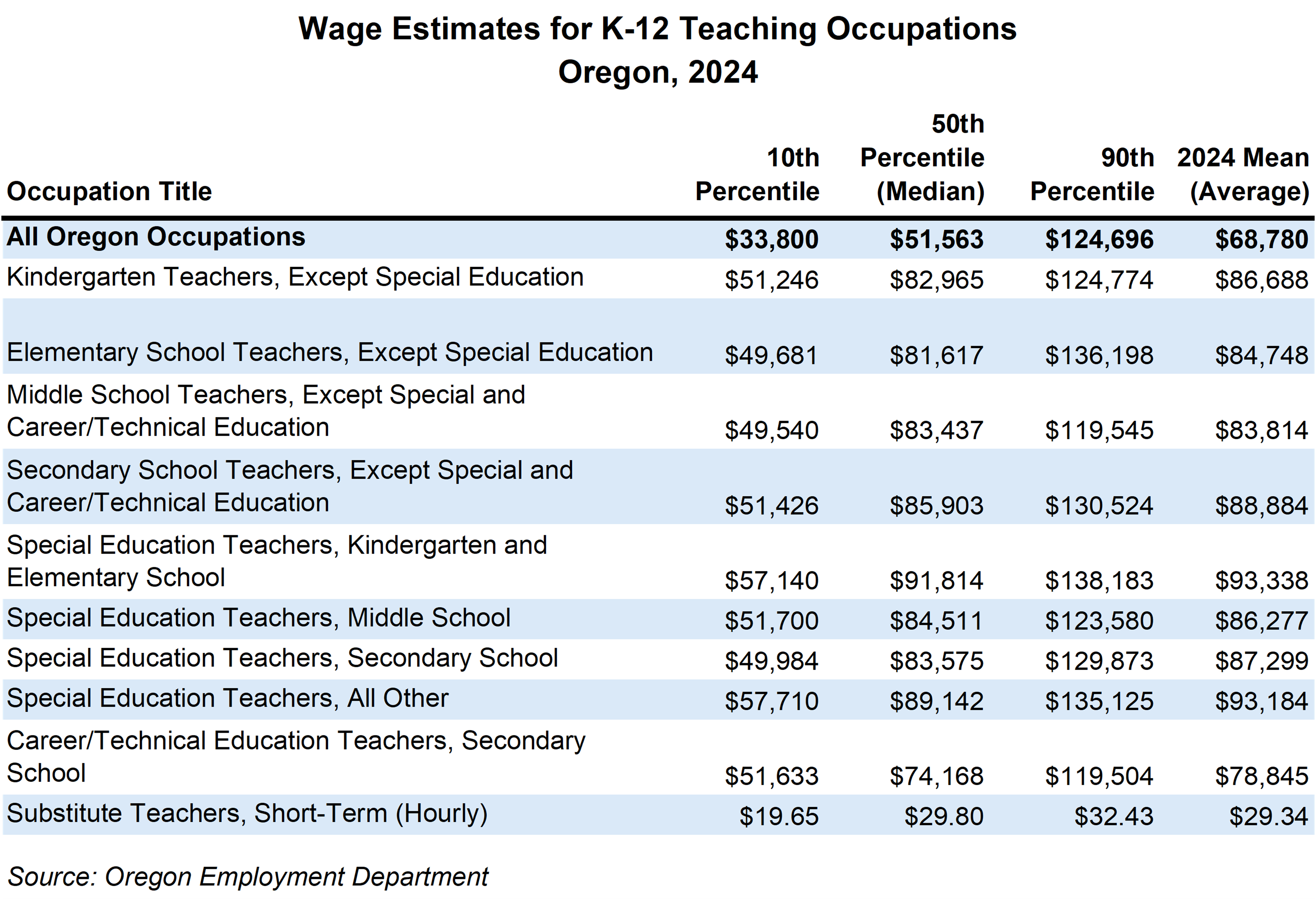 Oregon has come a long way from paying its teachers in flour and chickens! This occupation now offers stable income, with median annual salaries for K-12 teachers clustered between $81,617 and $91,814. From the novice to the veteran educator and varying by region of the state, salaries range from $50,000 per year at the 10th percentile, up to $120,000 or higher at the 90th percentile. Teacher pay is quite transparent in the public schools, as it is determined by each district’s salary schedule and published online. Salaries can be influenced by collective bargaining agreement between the teachers’ unions and the local school districts which results in cost-of-living adjustments or longevity ‘step’ increases for each year of teaching. Teachers may also earn merit pay for higher academic degrees completed beyond the bachelor’s degree. Median salaries for K-12 teachers are above average when compared with all occupations, and in the middle of the pack amongst the 170 occupations typically requiring a bachelor’s degree. (Find more job filters and comparisons at the QualityInfo.org Career Explorer.)