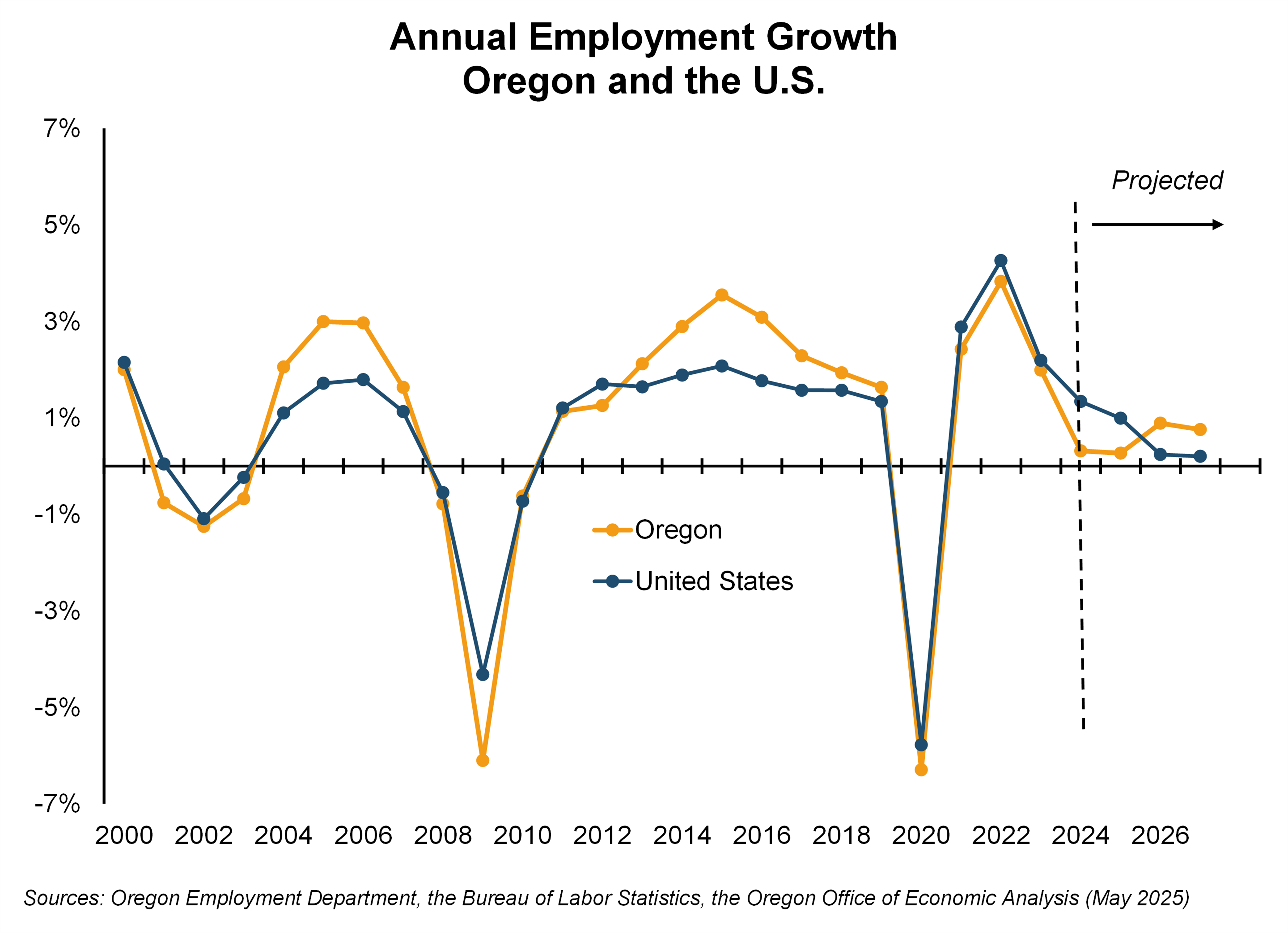 June 09, 2025It’s a challenging time for economic forecasters. Recent developments have heightened the risks facing the economy, but the extent to which they will impact inflation and job growth is highly uncertain. Will there be a recession, or will the nation -and Oregon- instead enter a period of positive, albeit anemic, economic growth? The latest forecast from the Oregon Office of Economic Analysis (OEA) assumes the latter in their baseline near-term scenario but acknowledges recession is still a ‘clear and present danger’.