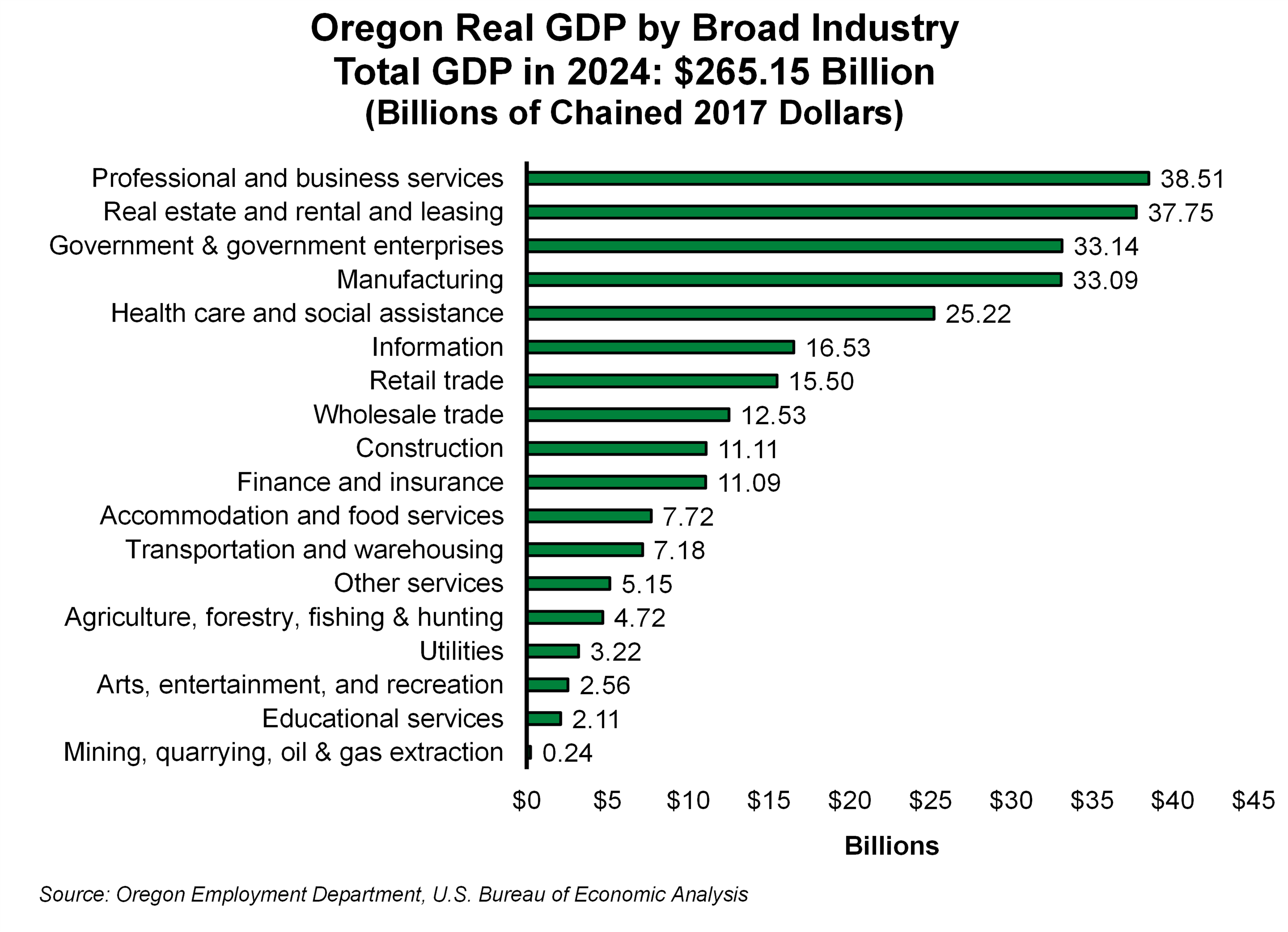Graph showing Oregon Real GDP by Broad Industry  Total GDP in 2024: $265.15 Billion
